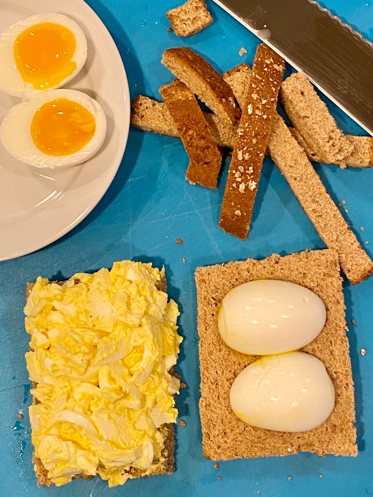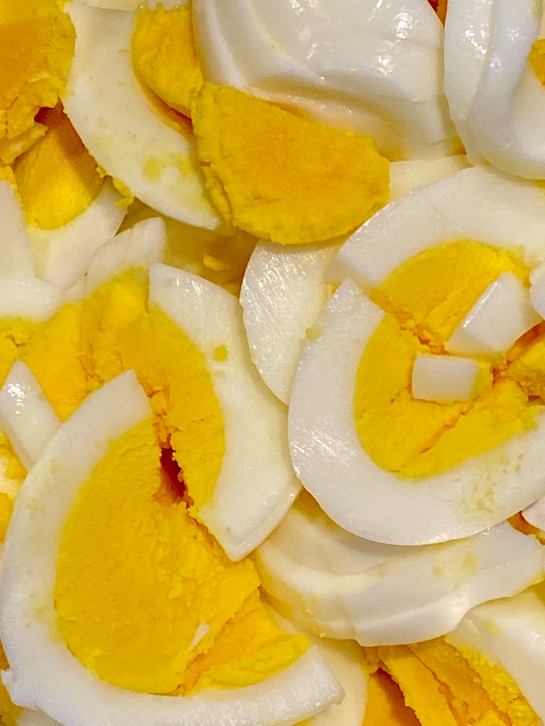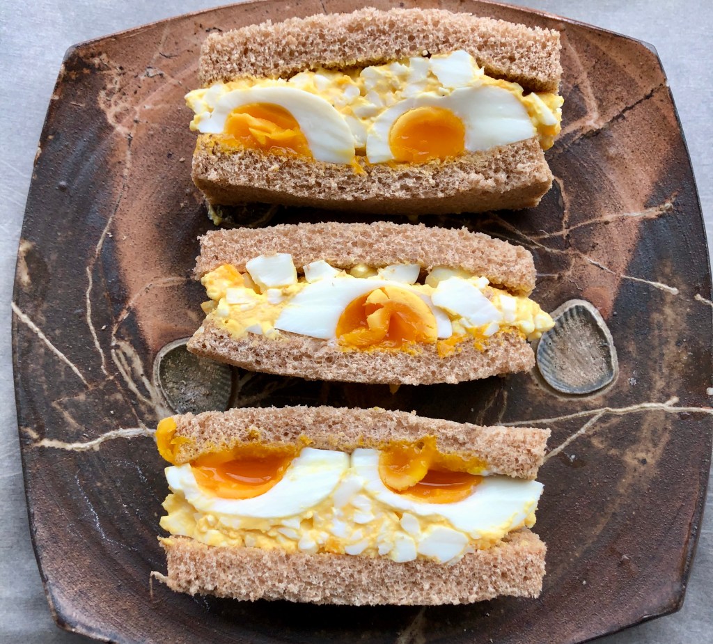 - Channel your inner child and trim the crust off your 8 slices of bread, feed the crust to your dog and lay the trimmed slices out on a clean cutting board or counter. Cut your jammy eggs in half and place one or two halves, yolk side down, in the center of four of the bread slices- 2 slices will have 2 egg halves and 2 will have 1 egg half. Evenly spread your egg salad over the four clean slices and gently place each slice over a slice with a jammy egg(s). Cut your sandwiches in half, horizontally through the jammy egg(s), and turn the sandwiches up to show off those jammy eggs. When you put the halves on plates- place a half with 1 jammy egg and a half with 2 jammy eggs on each plate.