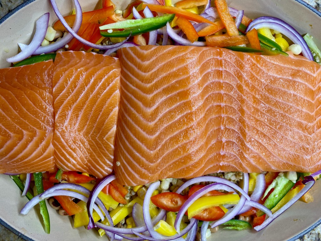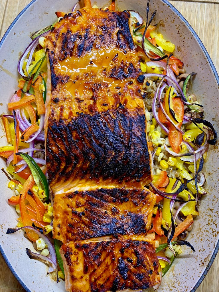 - Salmon. Season both sides of salmon with salt and pepper, place it, skin side down, over the succotash mixture and liberally brush or spoon top of salmon with Chili-Maple Syrup- not too much as it will run off into succotash. As you glaze the salmon while it cooks, a nice layer of caramelized syrup will build up to make it all good. Drizzle wine around vegetables not covered by the salmon.
