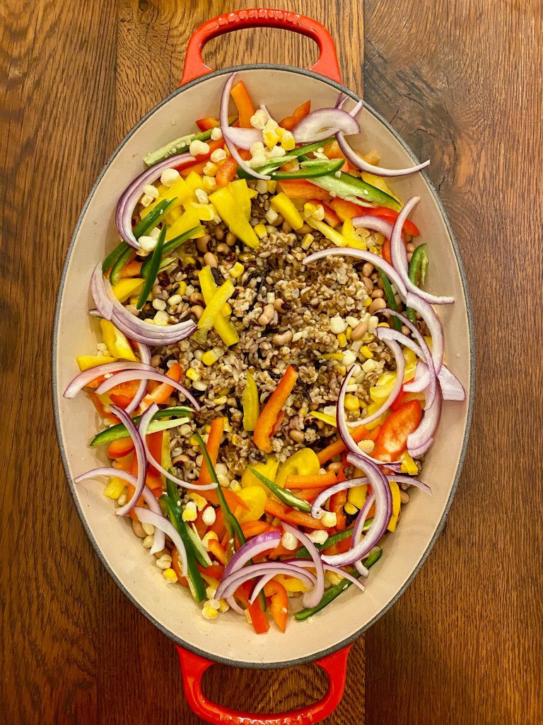 - Succotash. In the center of a large gratin dish or rimmed baking sheet, artfully arrange wild rice, beans, peppers, onion and corn.