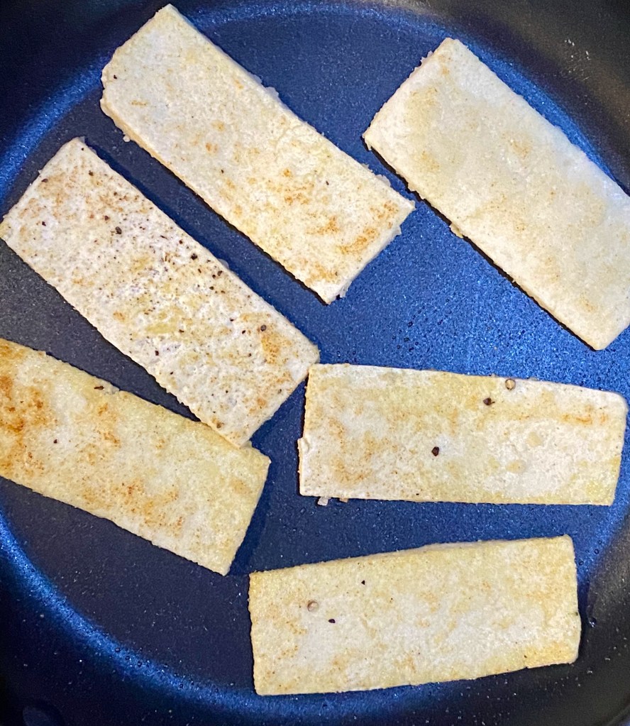 - Turn each block of tofu on its side to cut 1/3″ planks- you should have about 12 planks per block . Use kitchen towels to press out the flavorless water from tofu- it won’t take long.