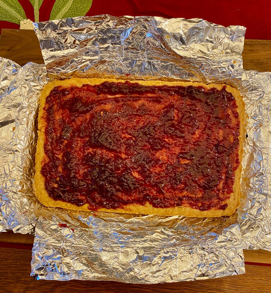 9. Top, Lift & Cut. Spoon jam on shortbread (give it a few minutes to soften from shortbread heat) then spread jam over the shortbread. Carefully air lift shortbread with Foil Sling from pan onto a cutting board. Sprinkle shortbread streusel over jam and carefully cut into squares for serving.