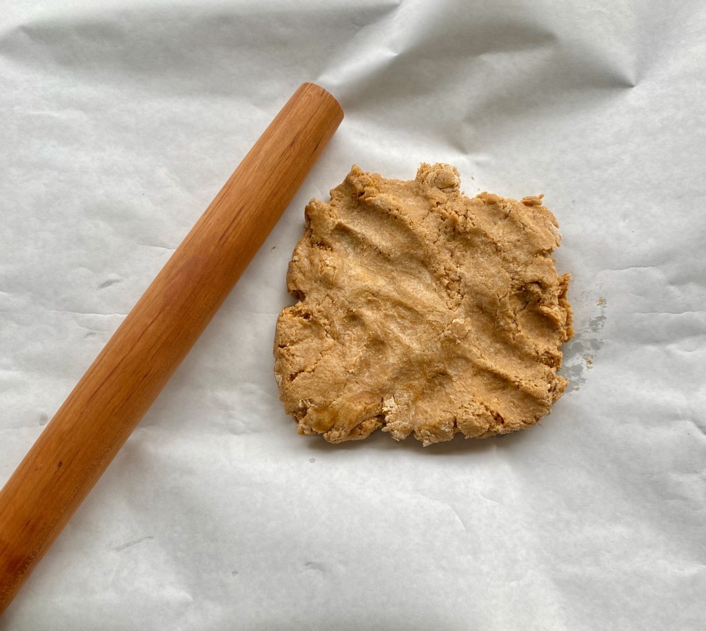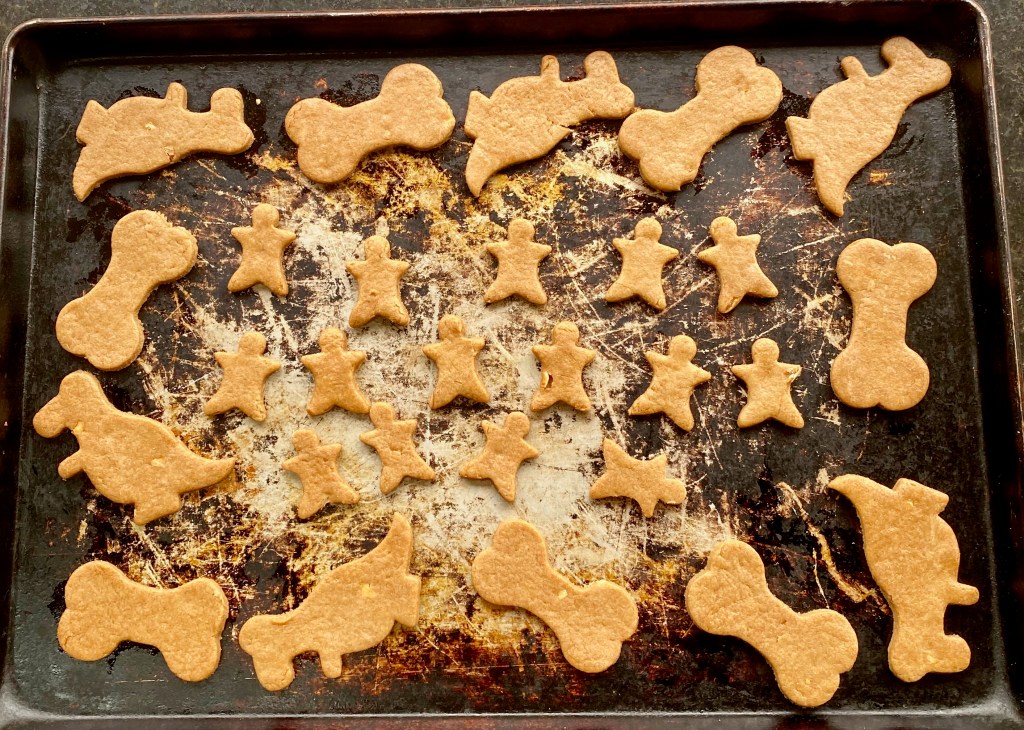 2. Cut It Out.  Roll dough out on counter top or cutting board (it is a bit oily and will leave a slick) to 1/4”-1/2” thickness. Cut into desired shapes for the size of your dog(s); gathering scrapes, rolling and cutting out again until all the dough is used. Place cut outs on an ungreased baking tray- the biscuits don’t expand all that much, so you can pack them on the tray!