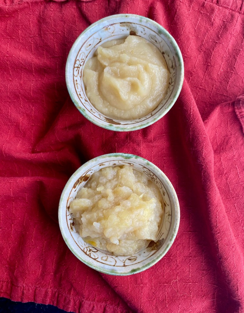 Quick Recipe: 1 Ingredient* Applesauce. It will take you about 7 minutes to peel and prep apples and 15 minutes to cook them saucy to get about 3 cups of applesauce. Peel and cut, into 2 inch chunks, 1.5 pounds of sweet, tender apples, like Gala, Ambrosia or Fuji, and 1.5 pounds of tart, tender apples, like Cortland, McIntosh or Empire. Put apples, with 1/2 teaspoon kosher salt and splash of lemon juice, if you have it, and about a cup of water (just enough to thinly coat the bottom of your pot) into a big pot over high heat. Cover, stirring every 4 or so minutes, until apples are soft enough to mash up into a sauce- about 10-15 minutes. Mash them up with the mashing device of your choice (In the last image below- the bottom sauce was mashed with a potato masher and the top with a stick blender). If you want, although I never want (especially in 1 Ingredient Applesauce), you can sweeten (sugar, maple syrup, honey) and/or spice (cinnamon, ginger, etc) your sauce up before you serve it warm, room temp or cold! *No- salt, lemon juice and water don’t count as ingredients. Why- “Because I said so!”. in my most annoying Dad Voice.