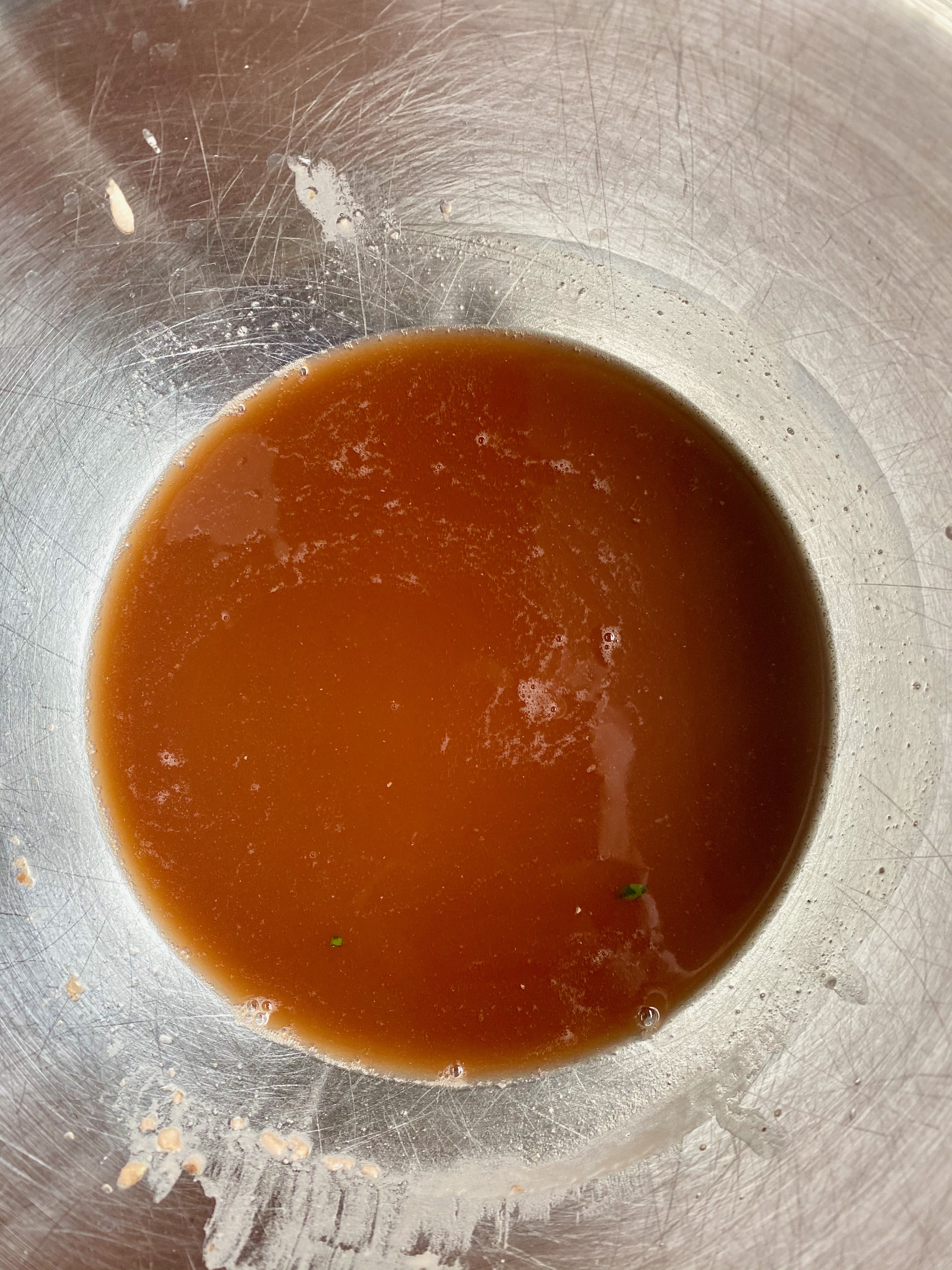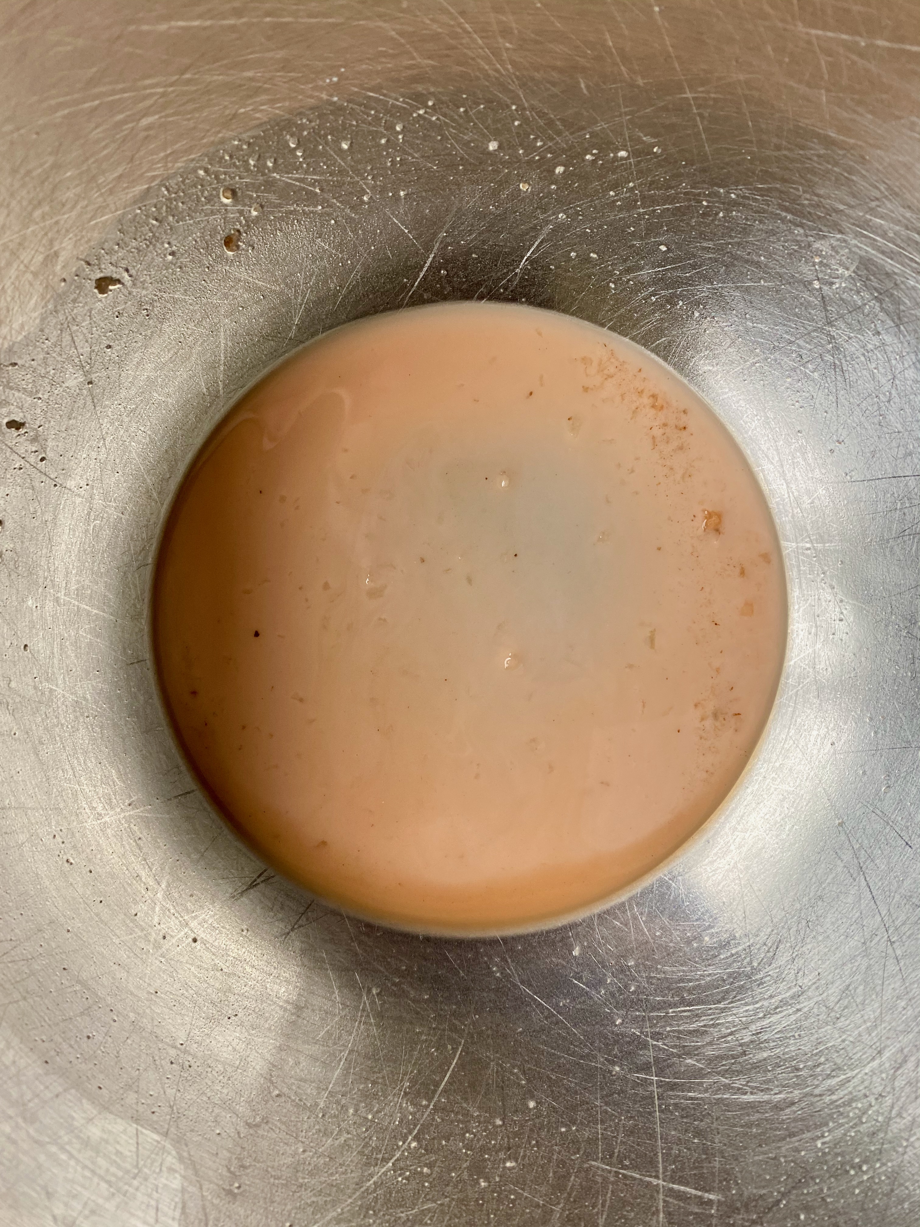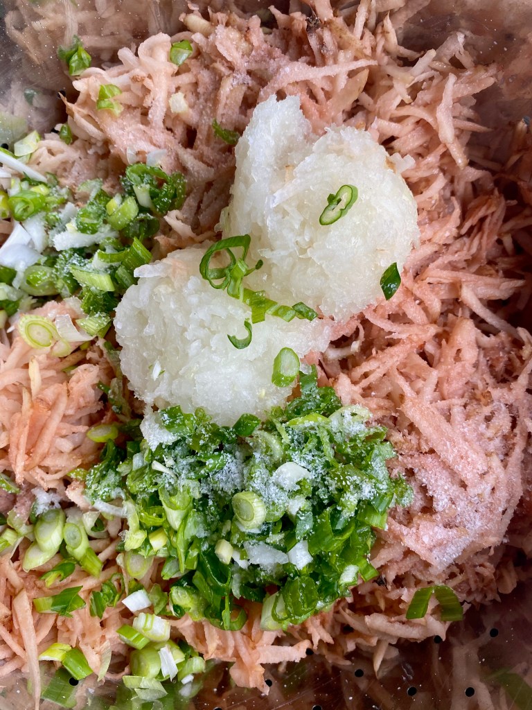 2. Don’t Dump Out the Potato Sludge! Place the colander with potato mix on a plate to the side of the bowl- it will drip more liquid- just you wait and see. You will see murky potato “juice” in the bowl and lurking at the bottom will be a layer of sticky potato starch that you want to keep in the bowl (along with the flour, it helps bind everything together and adds a bit more crisp, in my opinion), so carefully pour out the brown juice, leaving the starch behind.