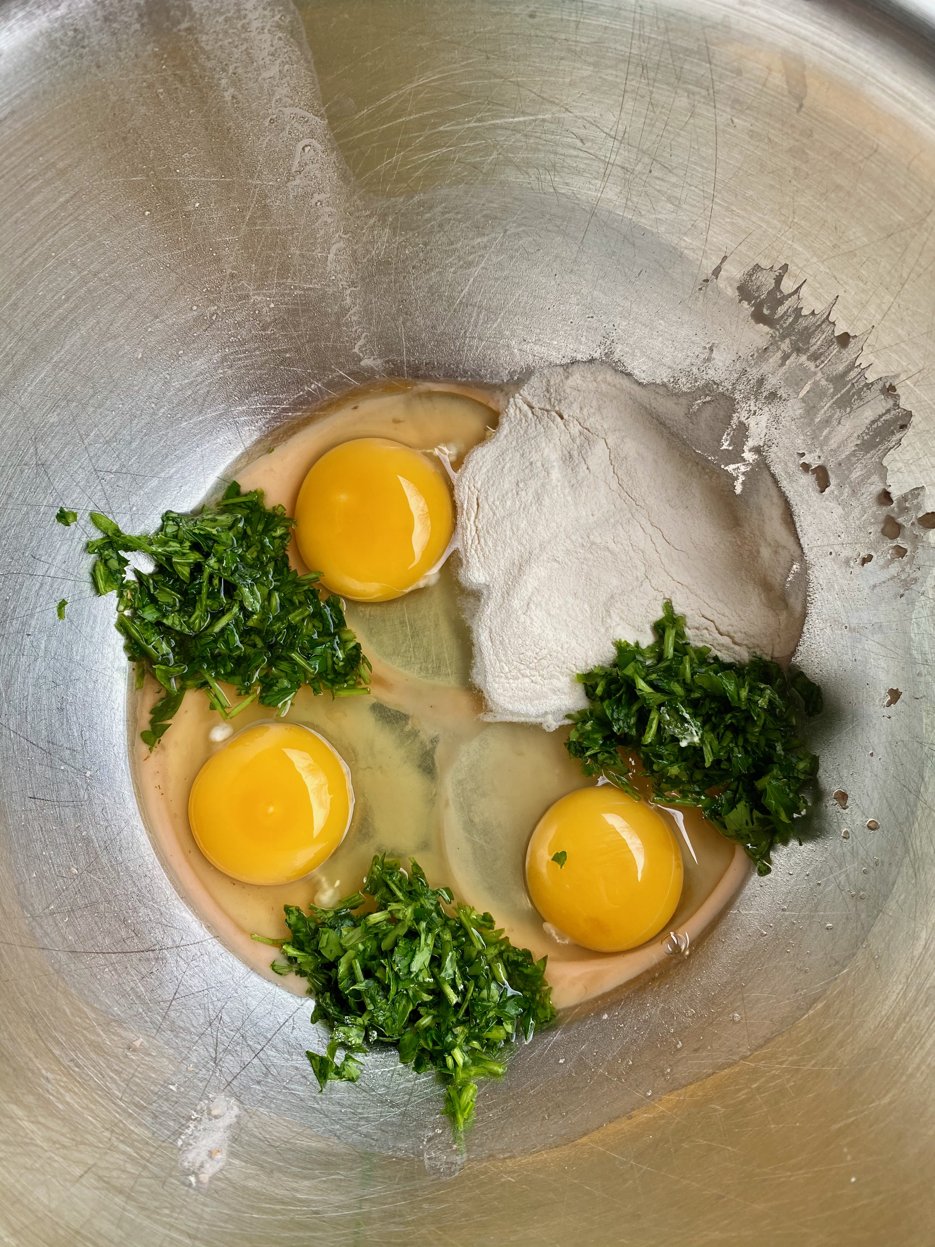 3. The Last of The Mix. To the starch, stir in eggs, flour, baking powder and parsley and then thoroughly mix in potato and onion mixture.