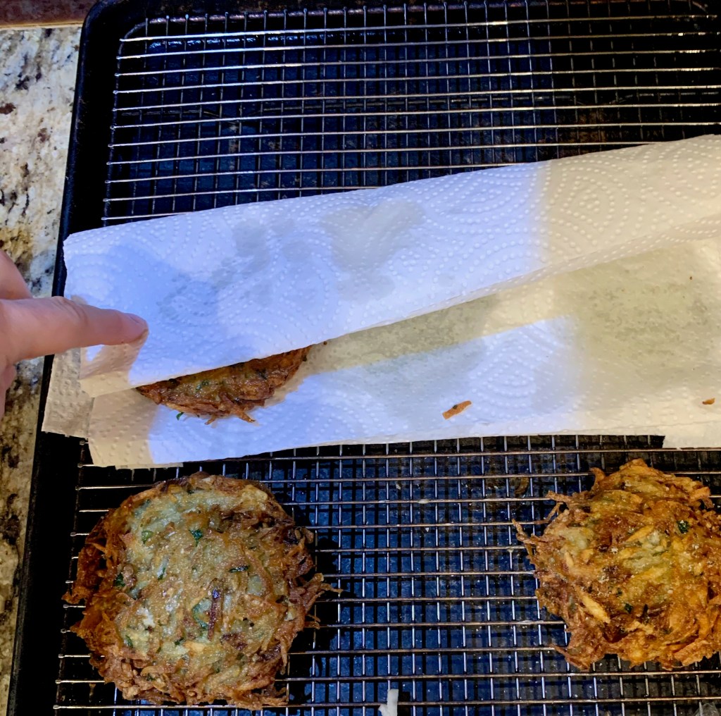 6. Blot Dry and Hold. While latkes are frying, set up a rack in a rimmed baking sheet, with a few paper towels or a kitchen towel on one half. When latkes are brown and crispy, carefully remove from oil, wick off oil on both sides with towel(s). Move to uncovered section of rack and season with a bit more salt while they’re hot if you like. Latkes can be held in a 200 degree oven while other batches cook.