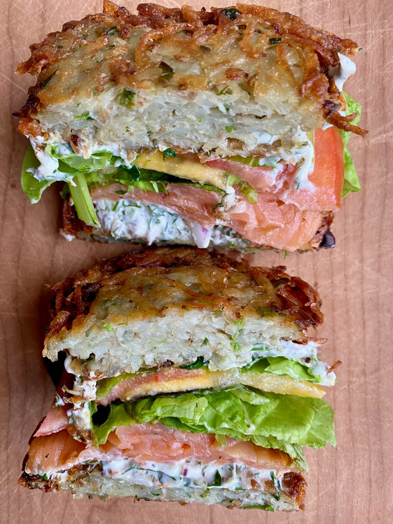 Keyword: latke, sandwich, smoked salmon, vegan option,