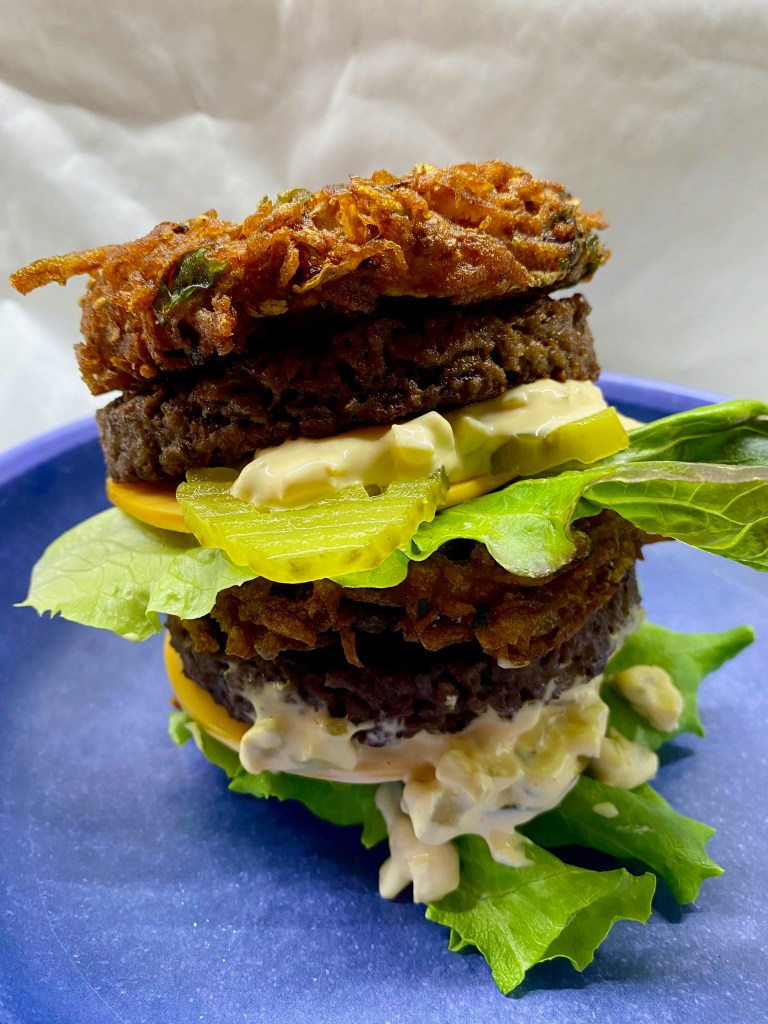 More Fun With Latkes. Of course you can put pretty much anything between fried potato buns and it will taste amazing, but here are some ideas to get you started. The Big or Little Lat. 1 or 2 pan seared all beef or all plant patty/patties, special sauce, lettuce, cheese, pickles, onions on a sesame seed latke bun. The Fishy Latke. Pan seared fish or a shrimp/fish burger with tartar sauce and half slice of cheese. The Buffalo Latke. Pan seared chicken thigh, shredded and mixed with Frank’s Hot Sauce, diced celery, carrots and Blue Cheese Dressing, topped with pickles. The Veggie Latke. Roasted, smoked paprika spiced and thinly sliced carrots (looks just like smoked salmon!), avocado mash, lettuce and tomatoes. The Wake Up Latke. Fried egg, cheese- add morning plant or animal meat, if you like.