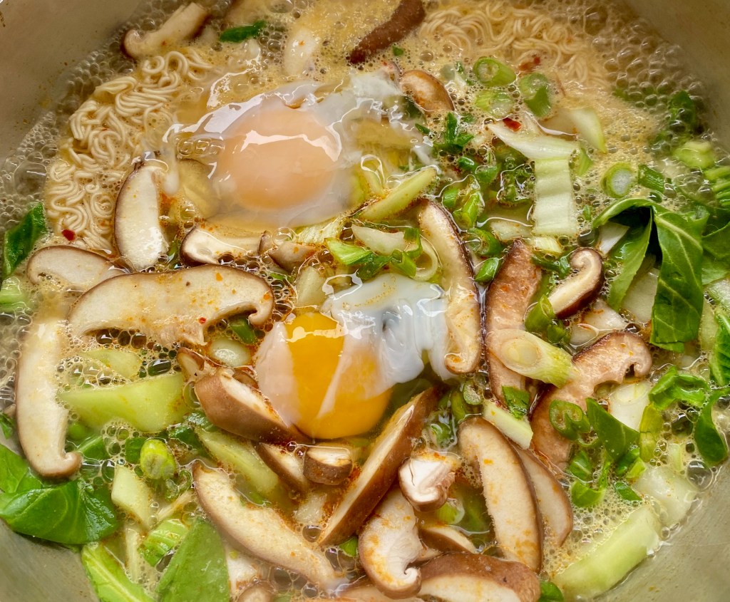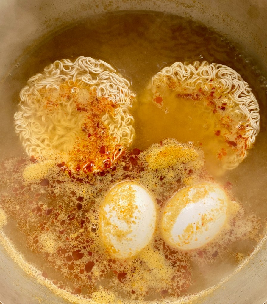 - Broth Pot. Add vegetable broth, miso, soy sauce and Spicy Chili Crisp to a large pot, stir and bring to a boil. As soon as it comes to a boil, add eggs and ramen, set two timers- one for the ramen (time according to package) and one for the eggs (6 minutes for runny eggs or to your food safety and taste preference)- and adjust heat to a vigorous simmer. Once cooked, portion noodles into two bowls and eggs into ice water to cool for peeling- reserve broth. Peel eggs and set aside.