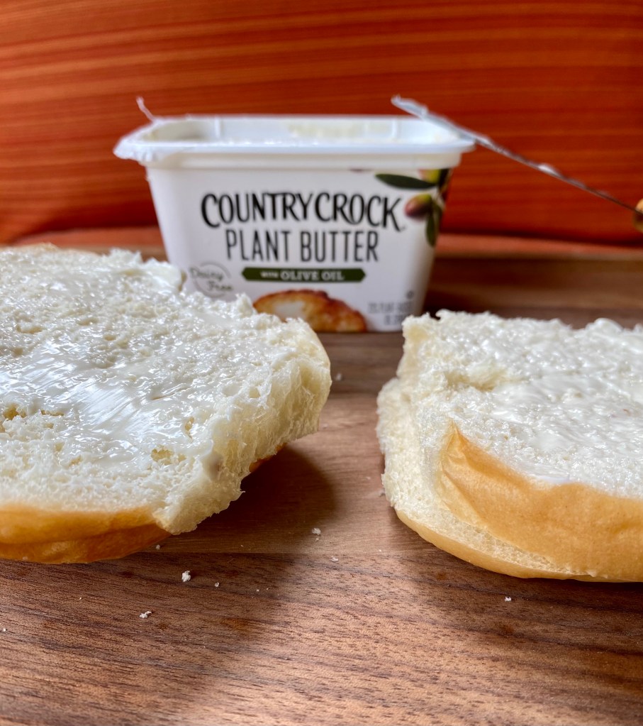 Better Burger Buns. It’s more than likely you’ll be eating a burger of some sort with these salads, so I thought I’d offer you some “Stay Crisp Bun Technology” (patent pending) to get the crispiest burger buns in town. It’s another page out of my crusade to keep crispy food crispy. Your burger buns will be infinitely better if you toast them and, smearing them with a little cow or plant butter before toasting, will give you the best toasting for sure. Now, just as soon as most people go to all the trouble of toasting their buns, they take away all that nice crisp by dousing them with one or more anti-crisp condiments and burger toppings. Fortunately, I have a way to save the crisp on your burger buns by simply cutting the top part of your buns in half crosswise, putting it back together to toast the bottom of the bun and then putting the condiments and toppings in between the cut upper bun were they stay separate from the crispy, toasted part of the bun as depicted below.
