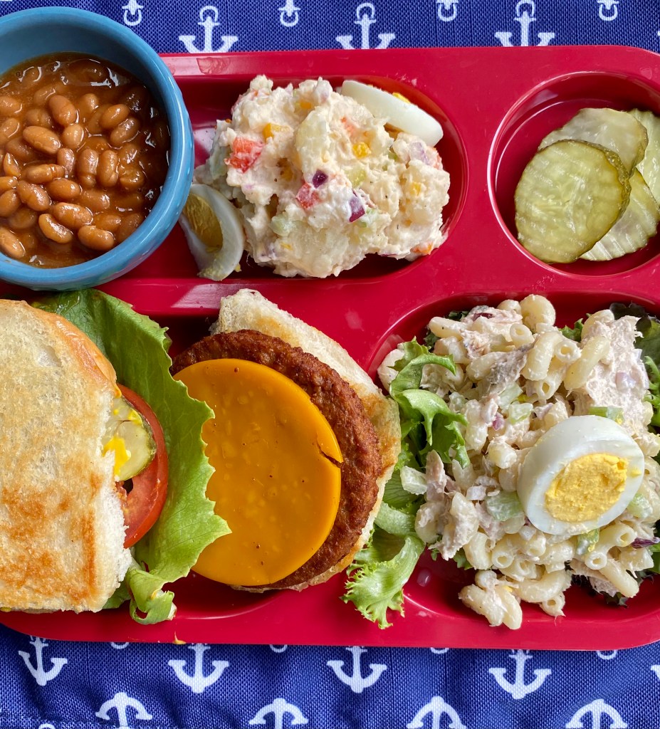 GM’s Potato Salad gets a punch of brightness from the sign of the times bottled Italian dressing, along with the pleasant, contrasting crunch and flavor from the finely minced vegetables, which never quite achieved the same status as bottled dressing back in the day. GM was way ahead of her time then, often trying to make many traditional recipes healthier and, while that works well here, I’m not sure I’ll be passing along her Chocolate Chip Oatmeal and Wheat Bran Cookie recipe any time soon! As for Granny, she was also an innovator with the addition of seafood to her macaroni salad- a much healthier option than the fatty, cured meats popular in pasta salads at the time. It may have only been canned tuna (your Great Aunt did a version with canned, tiny shrimp if you want to be fancy you can use this), but remember there was not even a whiff of fish at a cookout or usually not even at home, back then.