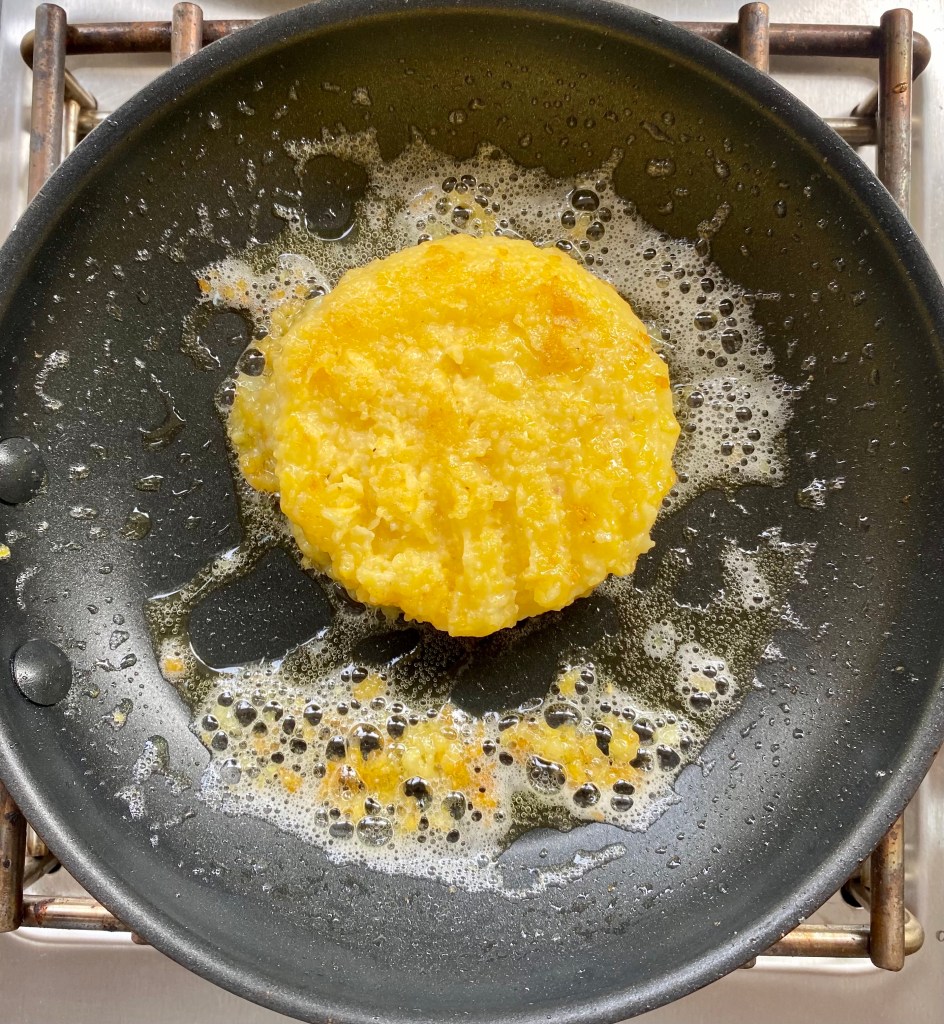 Use canola oil and some butter for browning and leave the cake be for several minutes on each side to develop a nice crust before flipping or removing. When you do flip or remove the cake, make sure you don’t leave that crust in the pan.