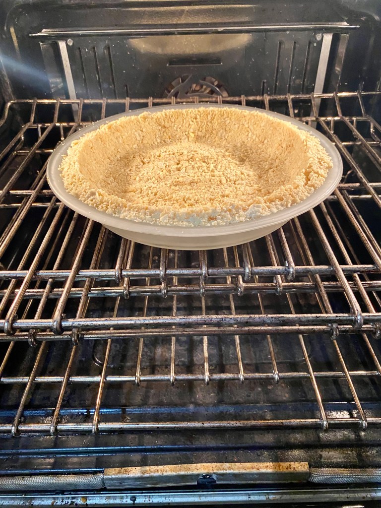 2. Crust Time.  Stir sugar into cracker crumbs, add butter and work butter evenly throughout cracker mix, with your impeccably clean hands, until the crumbs hold together like dough. Press crumb mix evenly into the bottom and up the sides of a 9-inch pie pan. Freeze for 15 minutes, then bake until the crust gets golden brown- about 15 minutes. Set crust on wire rake to cool and leave oven at 350 to cook pie in Step 4.