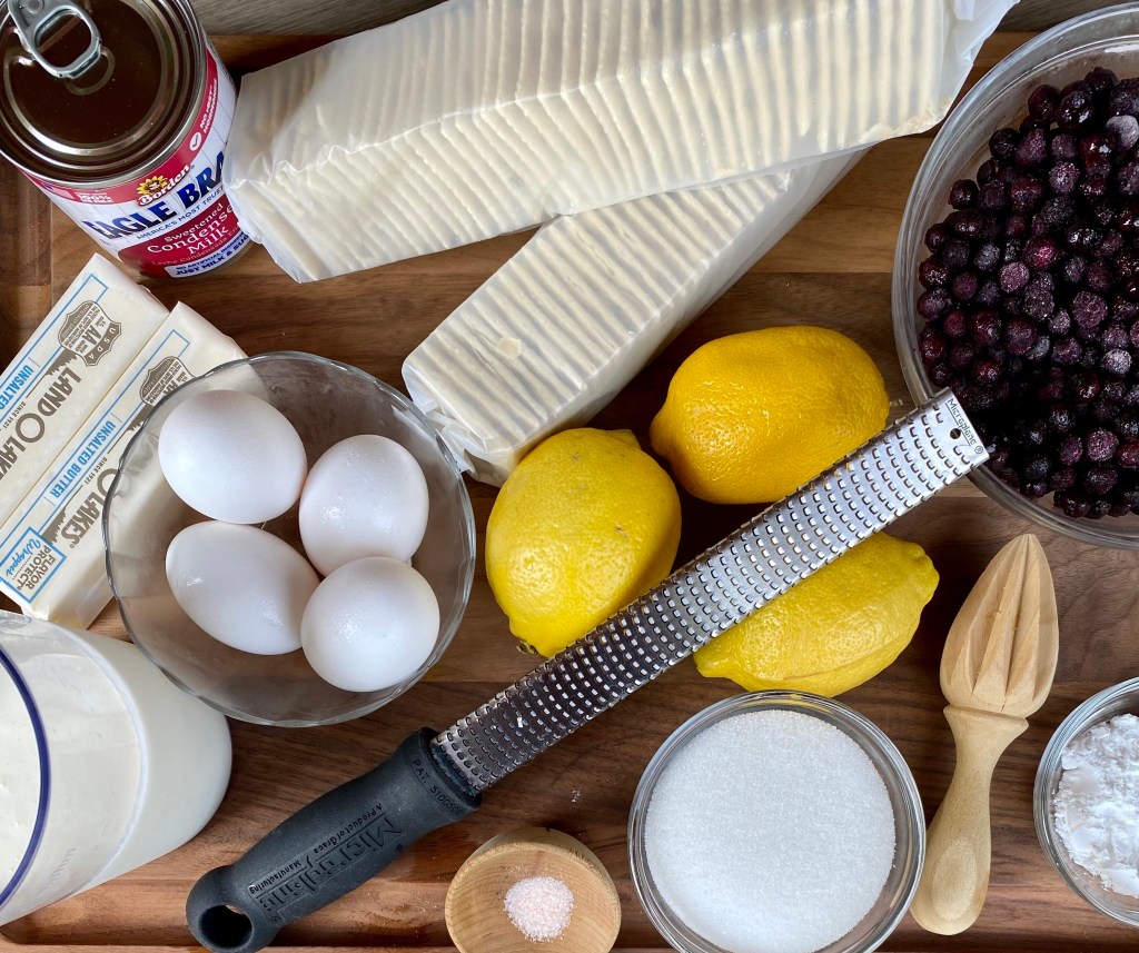 4. Bake and Chill.  Pour lemon filling into pie crust (It’s OK if crust is still a bit warm), and bake until the filling has set- about 15 minutes.  If you’re interested in the blueberry sauce, now would be a good time to make it (See Step 6 below). Let cooked pie cool a bit, then cover and refrigerate until filling is completely cold- at least 3-4 hours.