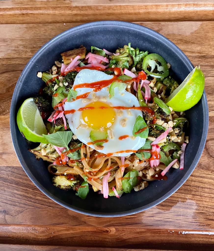 6. Let The Stir Frying Begin. Preheat a large nonstick frying/sauté pan over medium heat, add a few teaspoons of canola oil and stir in garlic. After 30 seconds, add half the sauce and stir to incorporate garlic. Add cooked noodles and toss with sauce. Add broccoli or leftovers and toss some more, adding more sauce to your liking- you may not want to use all of the Dad Thai Sauce. Portion stir fry into serving bowls or plates and top with egg, peanuts, limes, radishes, jalapenos, scallions, protein and/or fresh herbs. PS- I know you kids are often in a rush, but if you have the time, stir fry each portion individually, with a few tablespoons of sauce and a portion of broccoli, and I think you’ll agree it’s better than stir frying it all at once.