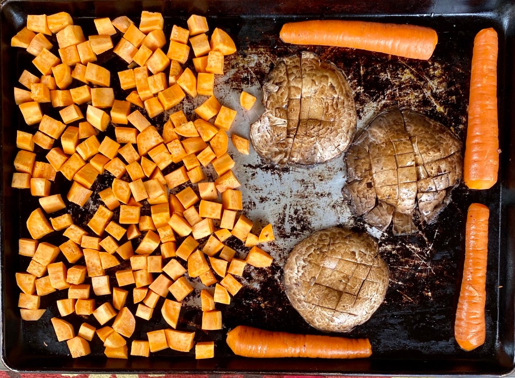 4. Portobello Burgers and Orange Hots. Cut a shallow, cross hatch pattern in the top of the mushroom cap, without cutting all the way through the cap. Place on the tray with the sweet potatoes, if there is room, or on a separate baking sheet if there isn’t. Drizzle soy sauce over both sides of mushroom caps. Add carrots to baking sheet and toss with oil, salt and pepper. Roast potatoes, carrots and mushrooms, flipping mushrooms after about 5 minutes and potatoes and carrots after about 15 minutes, until everything browns and becomes tender to your liking- about 5 minutes each side for mushroom (remove from oven and reserve once cooked) and 15 minutes each side for potatoes and carrots.