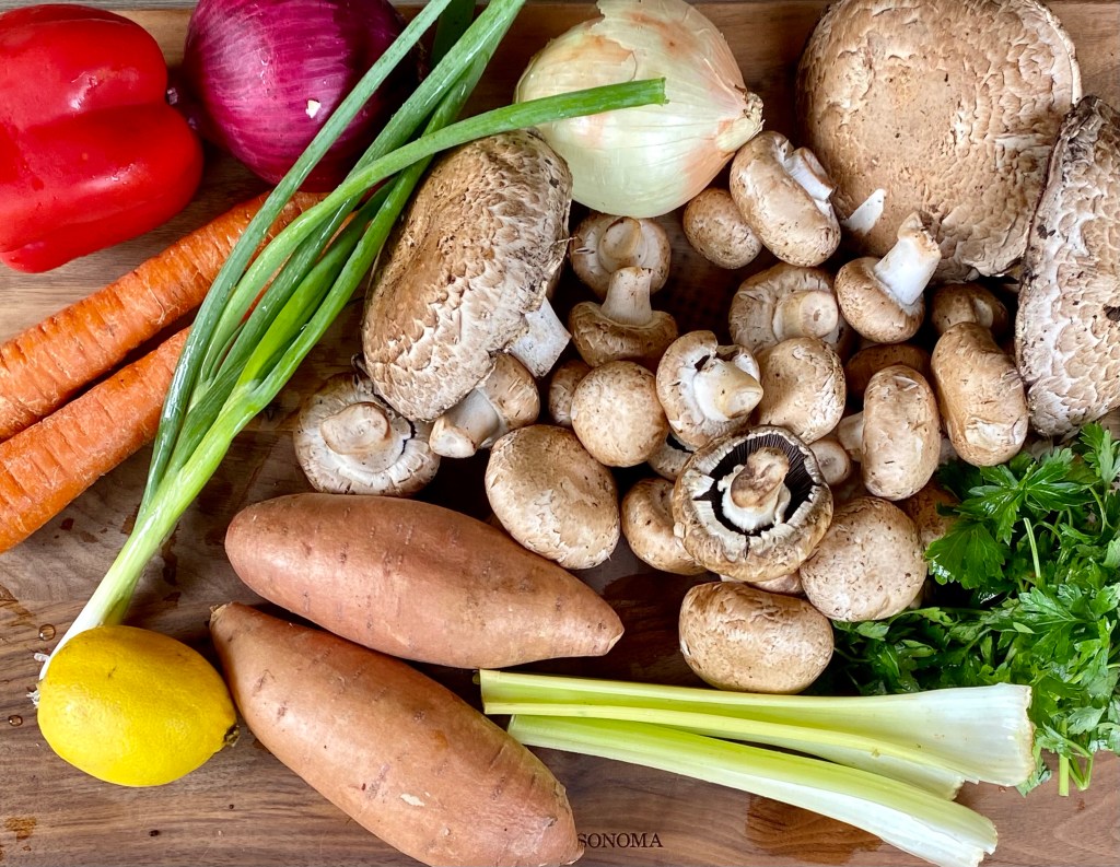 Why Not Fake Meat? You could certainly use veggie burgers/mince, veggie hot dogs, veggie sausages, veggie “chicken” or some other veggie “meat” for the plate in place of the mushrooms and carrots and, while they’re probably better for the environment, they’re not often that much more nutritious than their meaty counterparts, so why not keep it clean, simple and nutritious with additive and fat free mushrooms and carrots.