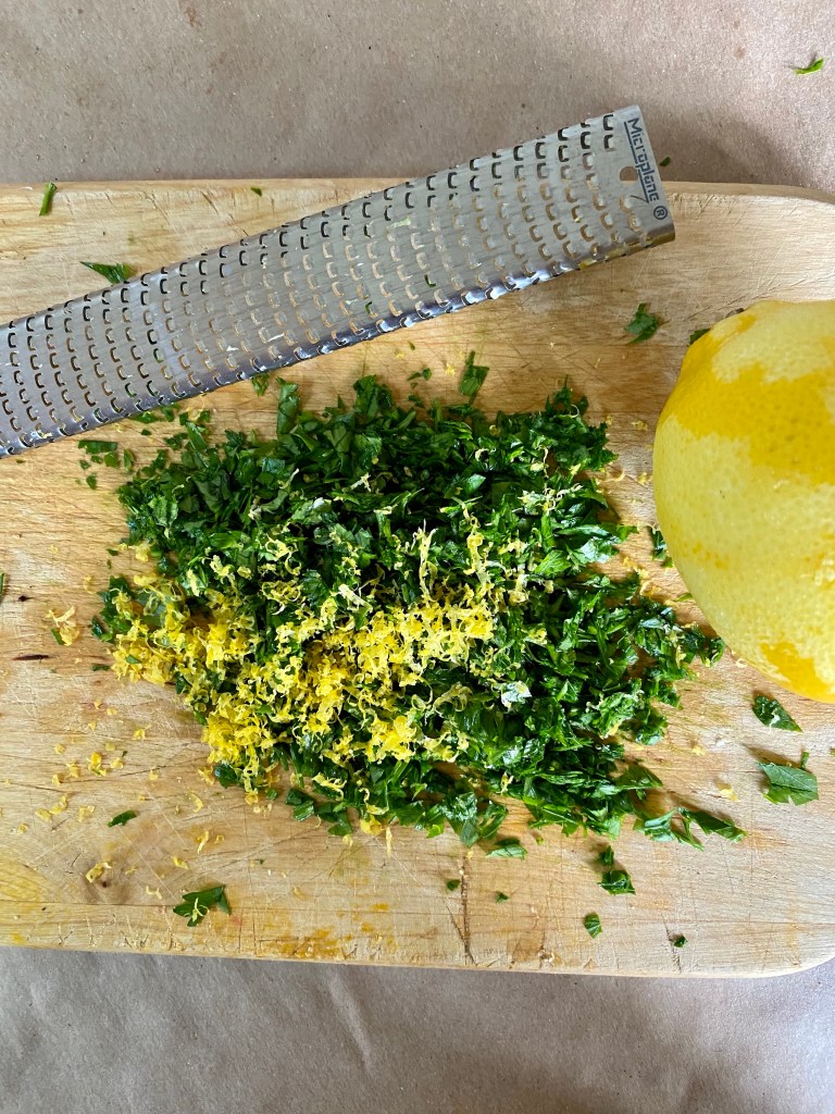 - 1/4 cup of minced parsley, mixed with zest of a lemon