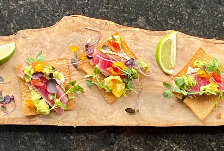 One of those happy surprises in life- finding sushi grade tuna nachos at a trendy eatery in North Carolina and coming up with a recipe to make at home. This recipe received high marks for being good looking and creative- especially the “Crab Rangoon” spread to hold it all together.