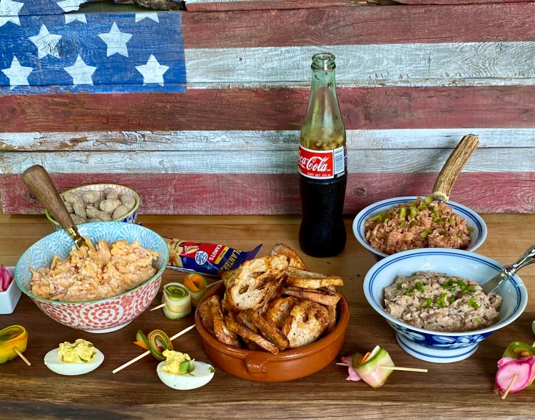 This post started with a simple recipe for Pimento Cheese and grew into an epic bounty for the table. I think the idea of BBQ crostini and using pulled chicken to make a spread made it even more fun- not to mention the Peanuts in Coke to wash it all down.