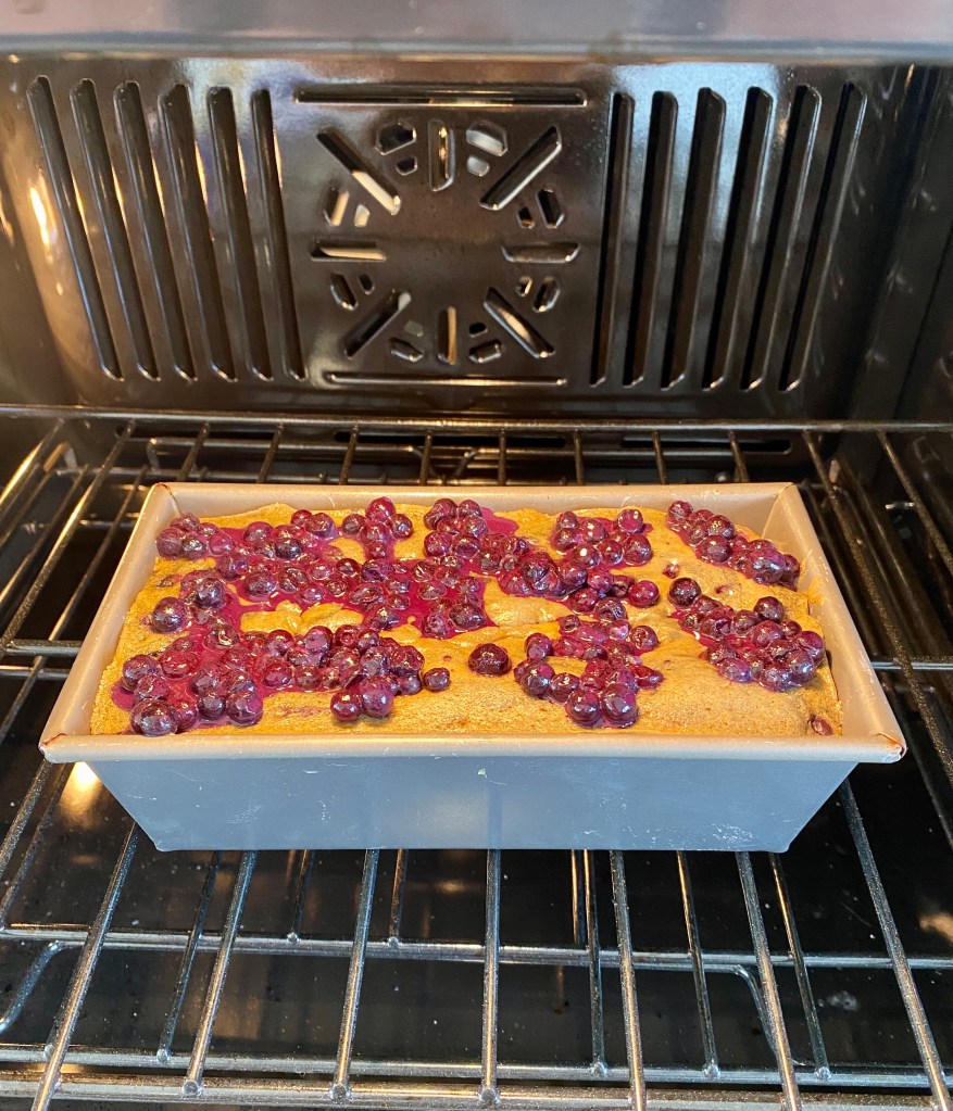 The Illusion of Levitating Fruit. Picky bakers have spent more time than The Dad trying to get fruit to levitate in baked goods, as opposed to sinking to the bottom, for better fruit distribution in every bite. This has been done by tossing your fruit with a tablespoon or two of flour or mixing 3/4 of the fruit into the batter while waiting for the quick bread to cook for about 20 minutes before adding the remaining 1/4 of the fruit to the top. I’ve tried both approaches together and separately, as well as just adding all the blueberries, “au naturel” (without flour coating), to the batter and all the breads tasted great to me, so you do you, as they say.
