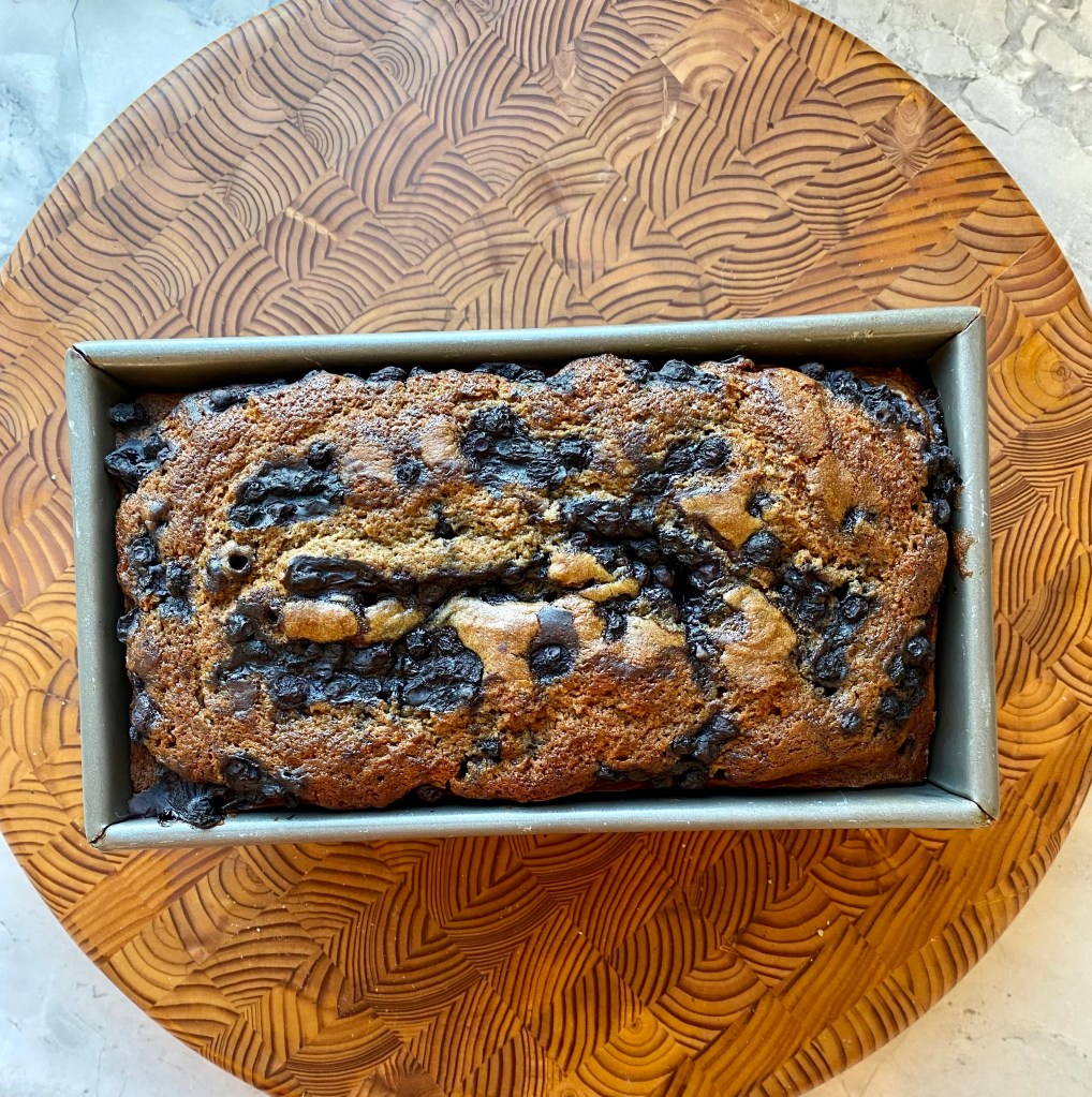Sticky Business. No one wants their loaf, or any other baked good, to stick to the pan, so that’s why many bakers offer a variety of methods to prevent this unhappy event- not just copious amounts of butter or oil all over the pan, but sometimes even flour or cocoa powder sprinkled lightly over the butter/oil or even a “parchment sling” (parchment sheets running the width and length of the pan that allow one to “air lift” the baked good from the pan). As for The Dad, flour and powder is messy business and a sling is a bit too dramatic (I mean this is baking not ER triage), so I go with heavy, non stick baking pans that I coat liberally with cow or plant butter and have never had a sticky situation. For added protection, I also use a rack to cool any baked good; make sure any baked good, is in fact, cooled before attempting to free it from its pan; and use a thin, non scrape spatula to work around and under the baked good as best I can. It also helps to place a large plate on top of the baking pan, to “spot” the baked good as you turn the baked good out onto the plate- using the plate to “spot” the baked good so it doesn’t release too fast, leaving pieces behind in the pan.