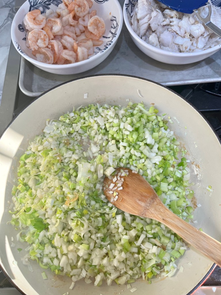 I also wanted to keep your budget in mind and give you the flexibility to use whatever fish or seafood you could afford. If you can find a “chowder mix”, it will likely be the best bargain ($4.99/lb in my local fish shop), but any mild white fish would be a good catch too. Moving up the money chain- shrimp, scallops, crab and lobster- which are hard to resist for the holidays and make the best of all holiday gifts if you ask me- certainly better than a tie from your kids (it’s a joke- I love that tie!).