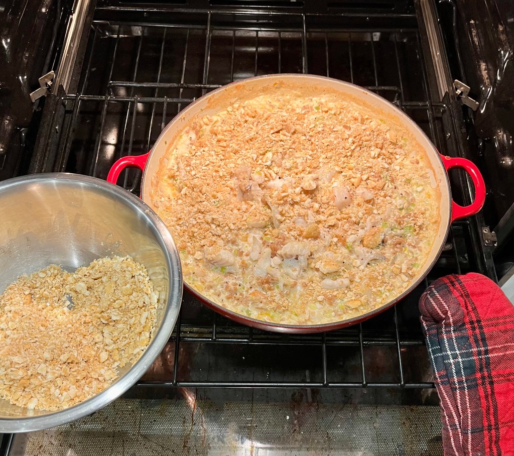 4. Get Baked. Transfer pan to oven and cook for 10 minutes. In the meantime, crush crackers (it helps to start the crushing in the sleeve) in a bowl and mix in butter or oil. Once dish bakes for 10 minutes, carefully and evenly spread Ritz crumbs over hot dish and bake until fish/seafood is 145° or the temperature that suits your comfort and taste- 10 to 15 minutes or more to your comfort, but use an instant read thermometer to be safe and sure. It’s not likely, but if crackers are browning too fast, cover loosely with foil. Serve immediately with a nice salad on the side.