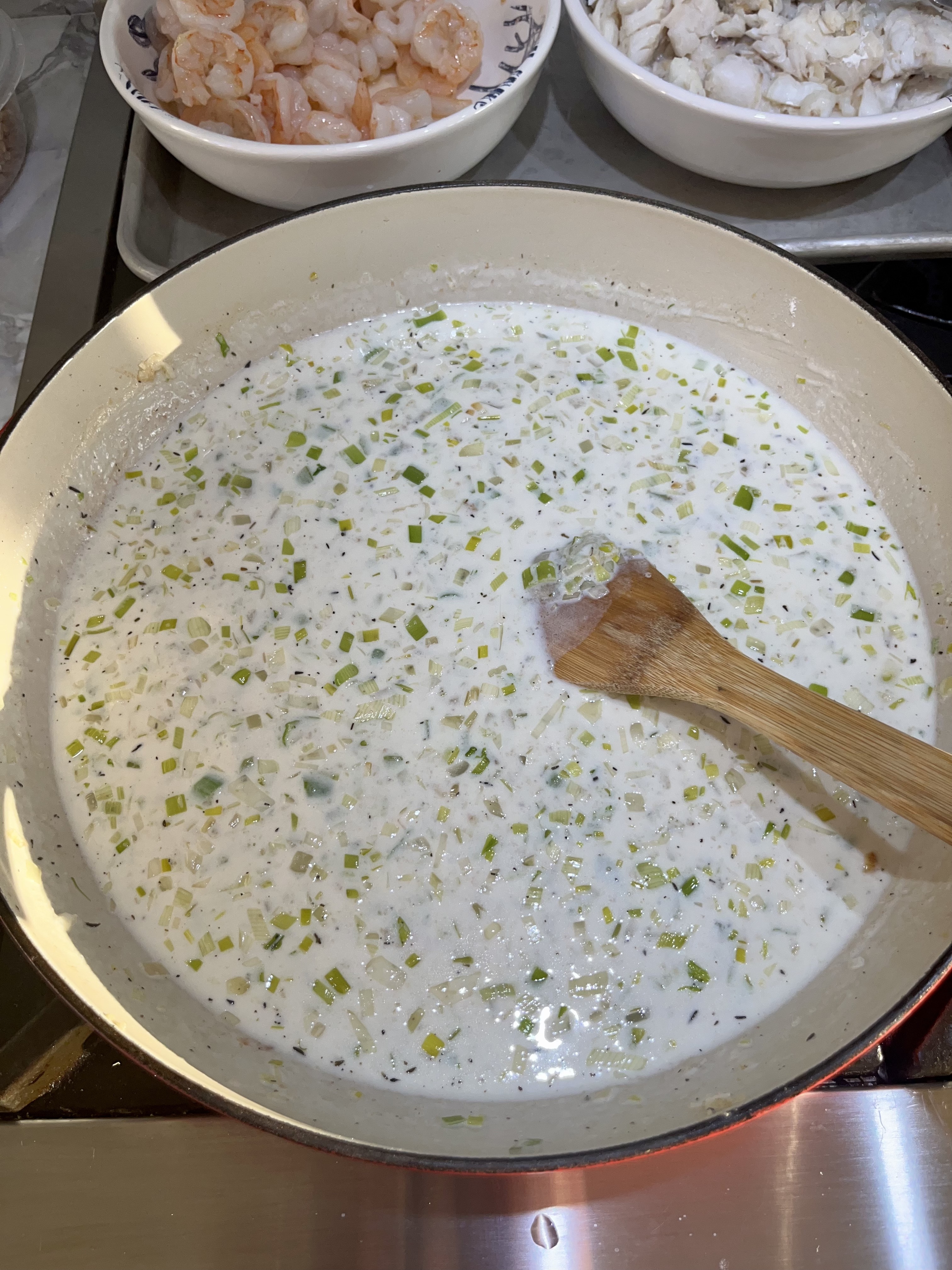 1. Gone Fishin’. Set up middle oven rack- preheat to 375°. Add 1 Tbsp each, canola oil and butter, to oven safe, 3-5 quart, high-sided skillet or enameled cast iron braiser (a short Dutch Oven) over medium heat. In single layer batches, adding more oil/butter as needed, lightly salt & sear fish/seafood- just a few minutes on each side to just cooked- it will cook further in oven. Set fish/seafood aside in large bowl. Note. Precooked fish/seafood may be used instead of or with the raw, but add to sauce at end of Step 3.