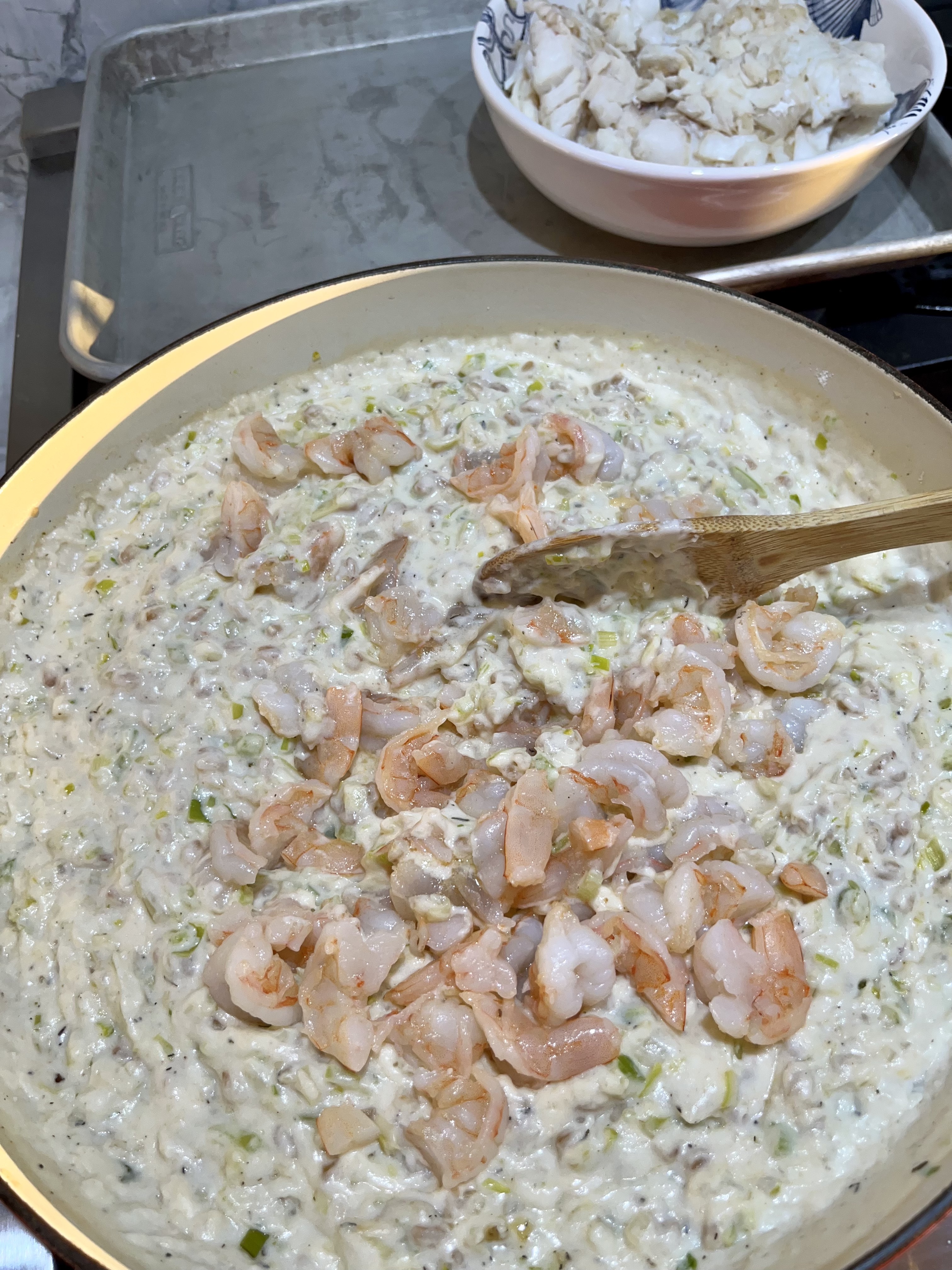 Rainy Days and Overcooked Fish Get Me Down. I don’t like over cooking food- that’s why they invented instant read thermometers! I especially don’t like to overcook fish and, as you may have noticed, the risk of overcooking any fish in a casserole (so many lobster mac and cheese recipes do this) runs high. That’s why I suggest the fish/seafood is just cooked before the dish goes into the oven. I am also comfortable adding raw fish/seafood to the sauce at the end of Step 3 and cooking it in the oven (times vary).