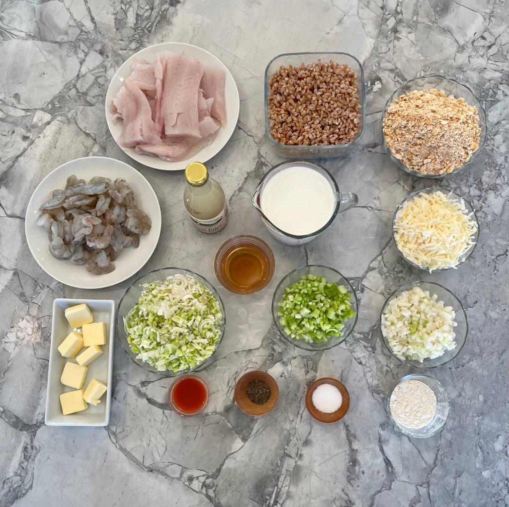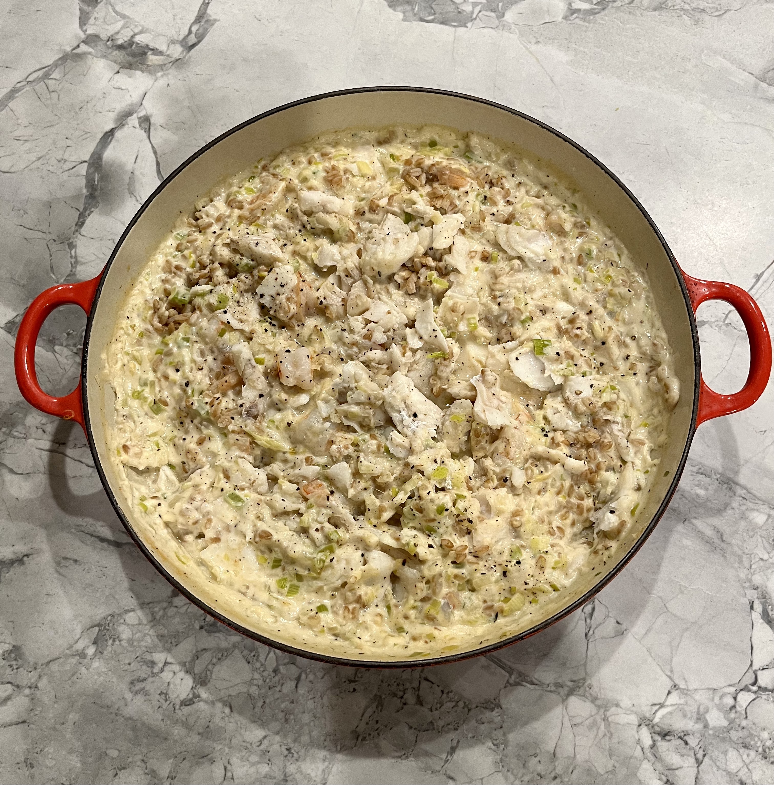 3. Roux The Day. Add flour to pan, stir 1-2 min. to toast the raw flour taste away. Add sherry and stir a bit to combine and cook off harshness of alcohol for a minute or so. Add clam juice, if using, with half & half and/or milk and bring to a simmer- stirring to prevent any lumps. Season with hot sauce and 1/2 tsp kosher salt. Simmer sauce until it thickens and melt in cheese if you wish- taste and adjust seasoning. Off heat, stir in farro and reserved fish/seafood (sturdier seafood first and fold in any delicate filets last) with accumulated juices.