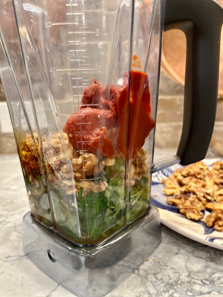 The Sauce Is The Boss. This has to be one of the best sauces in terms of flavor payback for the amount of work you put into it! I mean, you’re just tossing stuff (no knife skills required) into a blender and pressing buttons or turning dials. As for the flavor- the earthy creaminess the walnuts add is sublime and the bracing tartness from the pomegranate molasses, with the heat of the peppers, is a welcomed counterpunch to the palate.