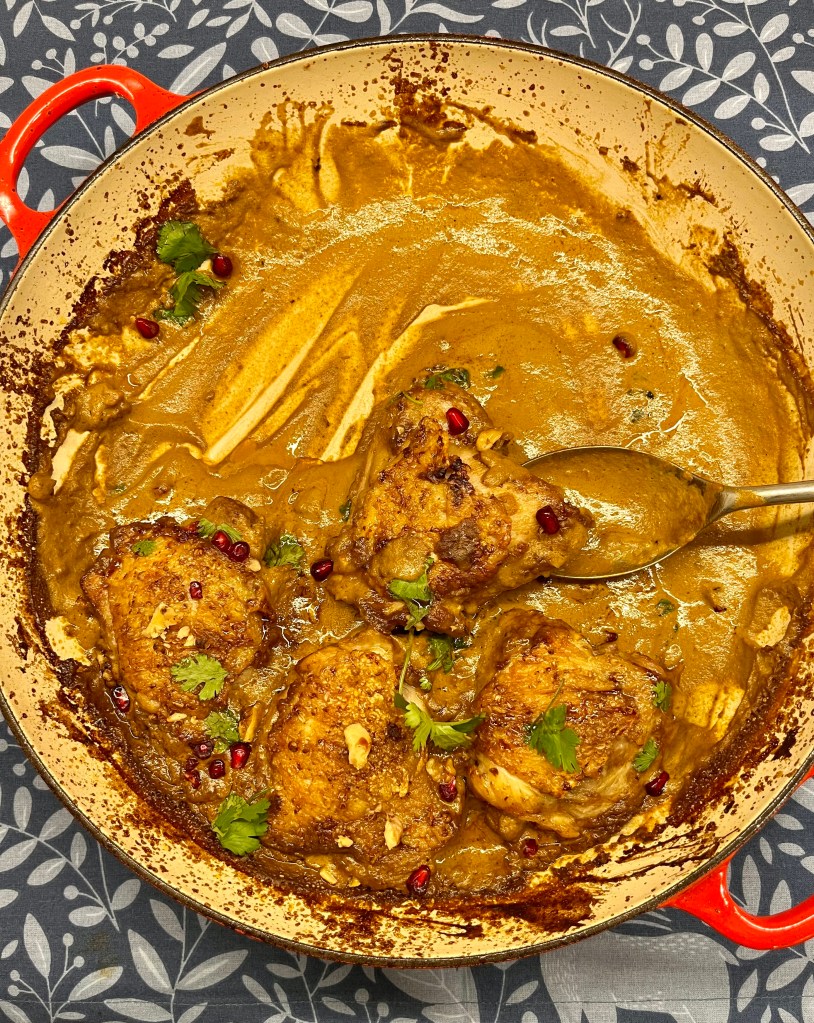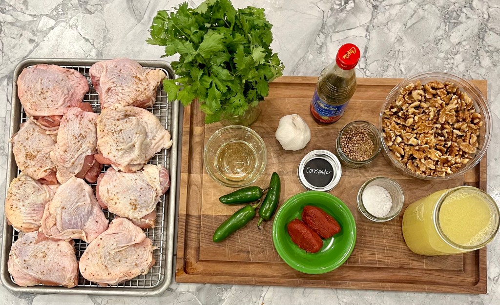 December 22, 2022. Dear Kids– Every year, which would be just two years, since I started this blog, I like to share my favorite recipe from all the recipes developed by another source that I’ve cooked over the year. Last year, it was this Smarty Pants, Veggie Veggie Parm Parm, Dump Casserole, certainly a mouthful, but a tasty mouthful at that. This year, that dubious honor goes to my version of the Georgian Chicken with Walnut-Cilantro Sauce found in the Milk Streets: Tuesday Nights cookbook— an ultra crispy batch of chicken thighs in a tart, earthy and creamy sauce that’s easy to make ironically vegan, but with such a depth of flavor you would never believe it.