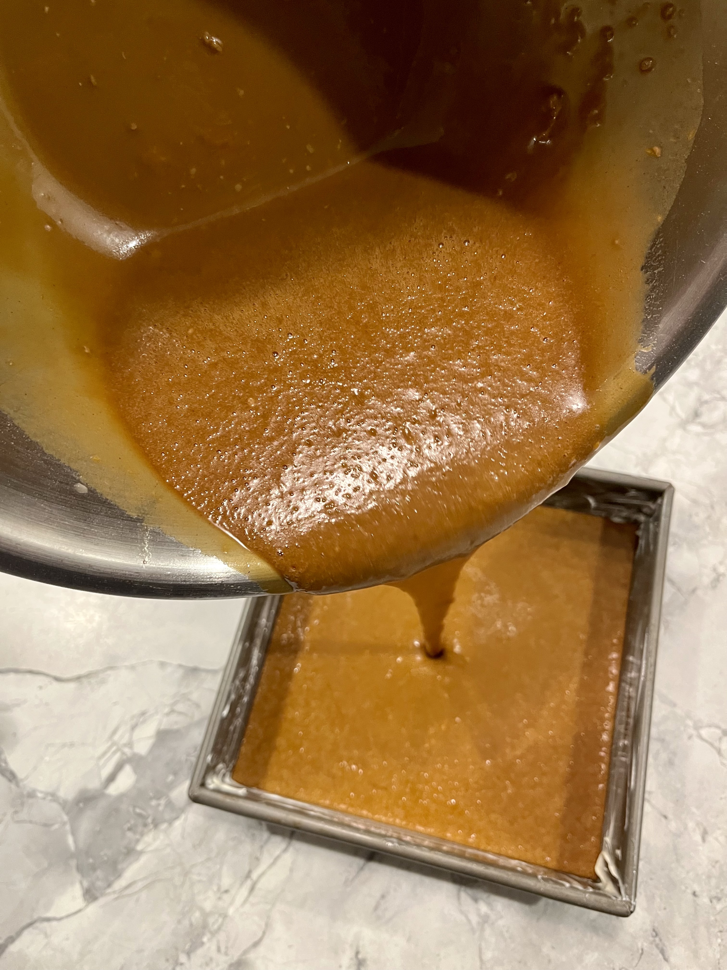3. A Very Pourable Batter. Thoroughly combined contents of Wet Bowl with contents of Dry Bowl, which will give you a very pourable batter. Pour into greased pan and bake until toothpick comes out clean- about 35-45 minutes. Cool slightly on rack. Serve with whipped cream and/or vanilla ice cream and salted caramel sauce.