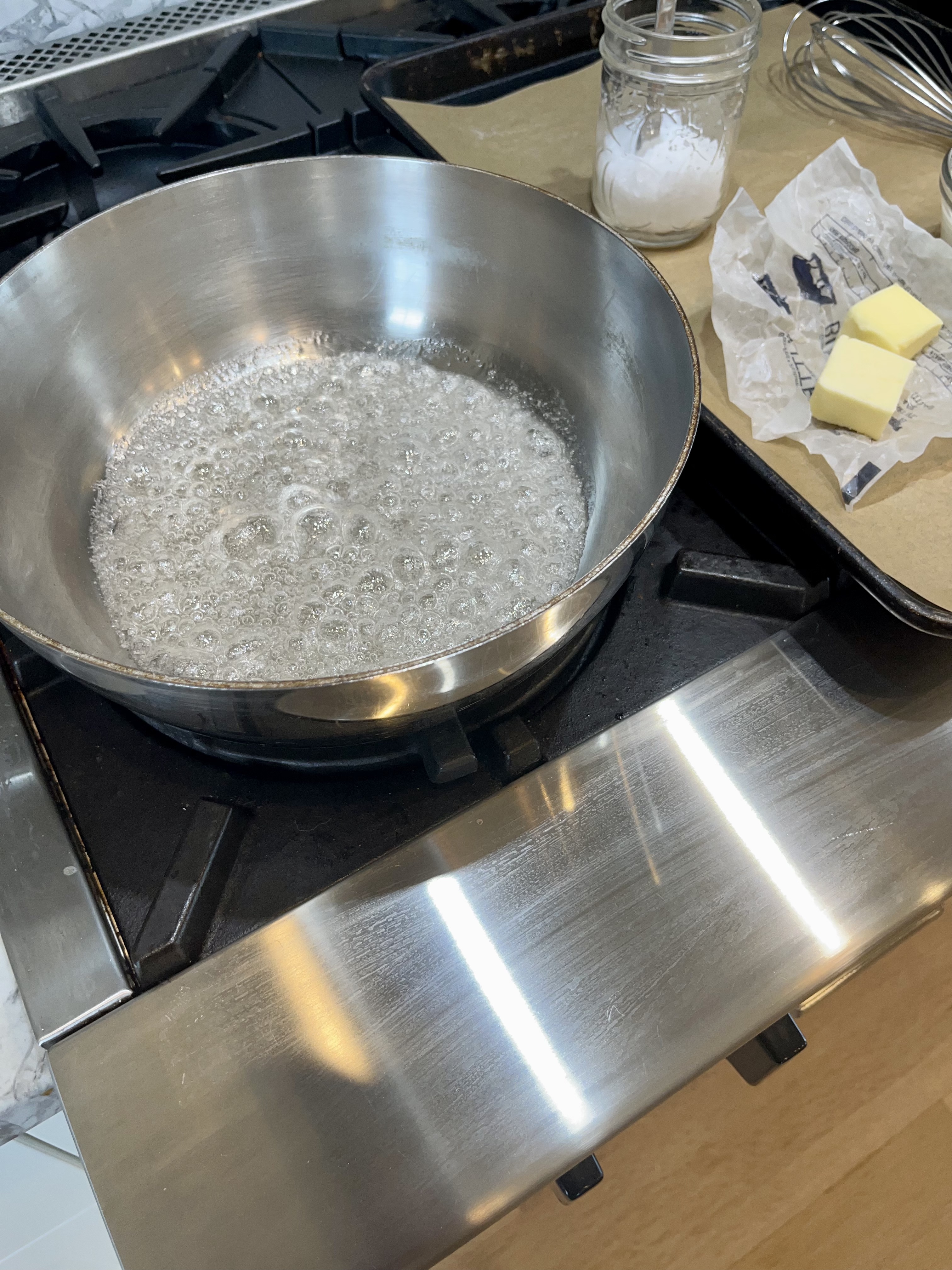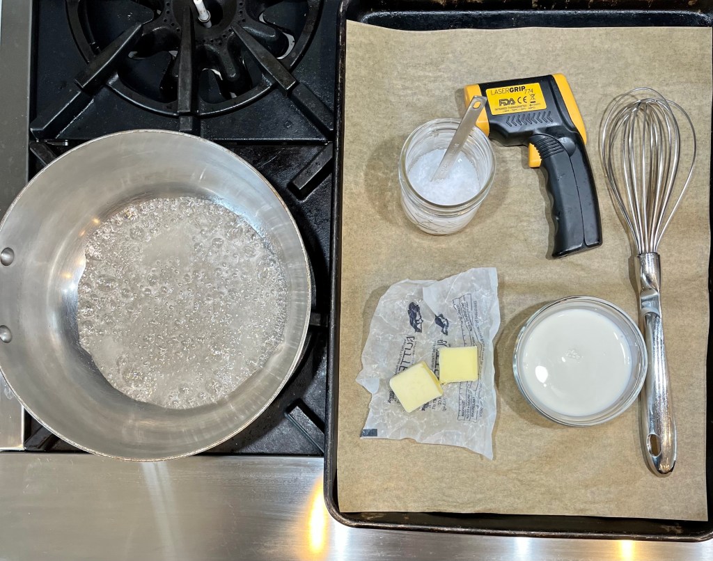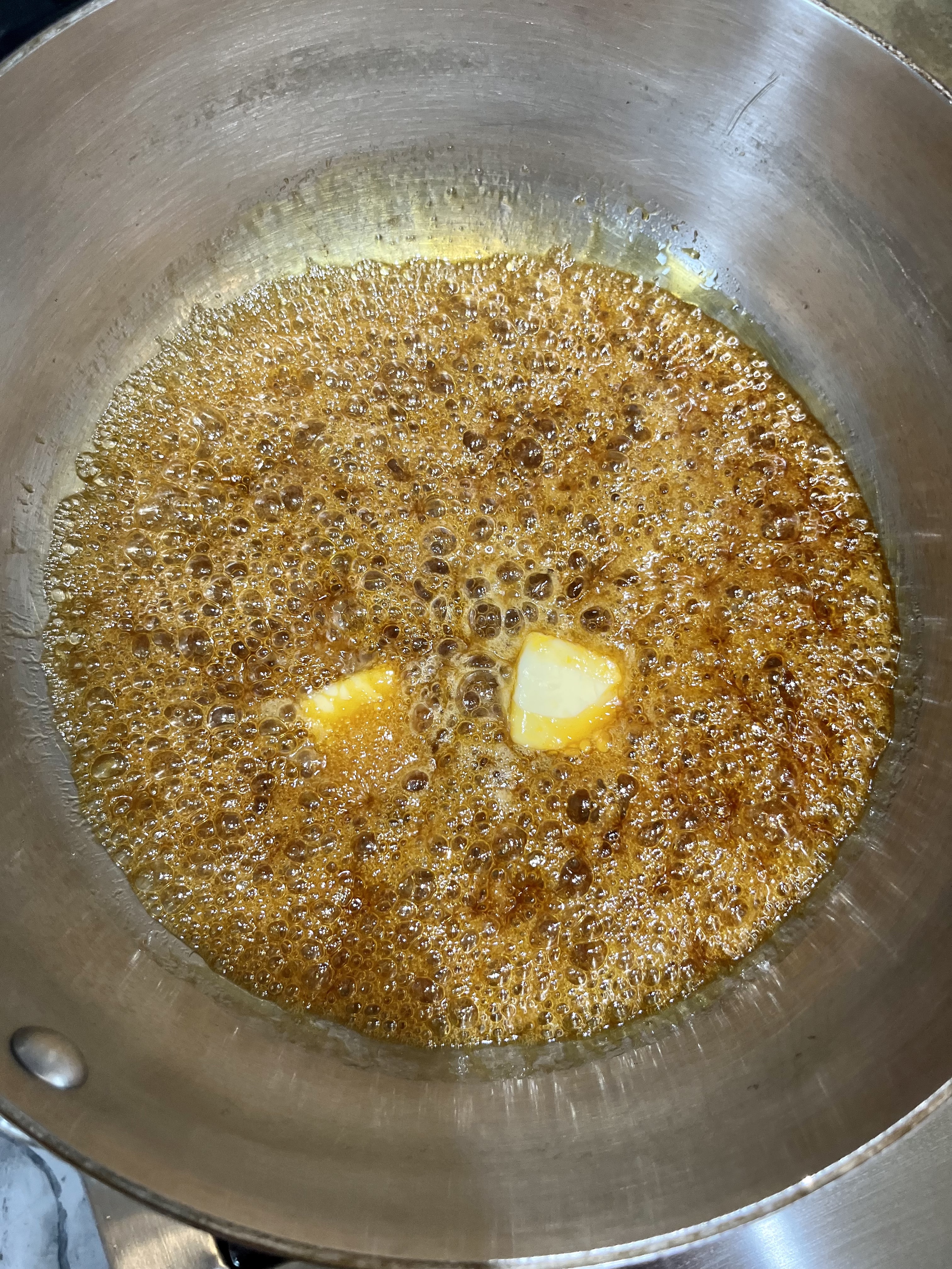 2. Hot Lava! Understand when you add the butter and cream to the caramel in this step, the different temperatures of the butter and cream compared to the molten hot caramel will cause the sauce to “erupt”, bringing pain and damage to any living thing in its path– sometimes it erupts to 3 times its original volume- that’s why you want a deep pan. Keep this in mind as you continue. PS- If butter and cream are room temperature or warmed before adding, the reaction is lessened.