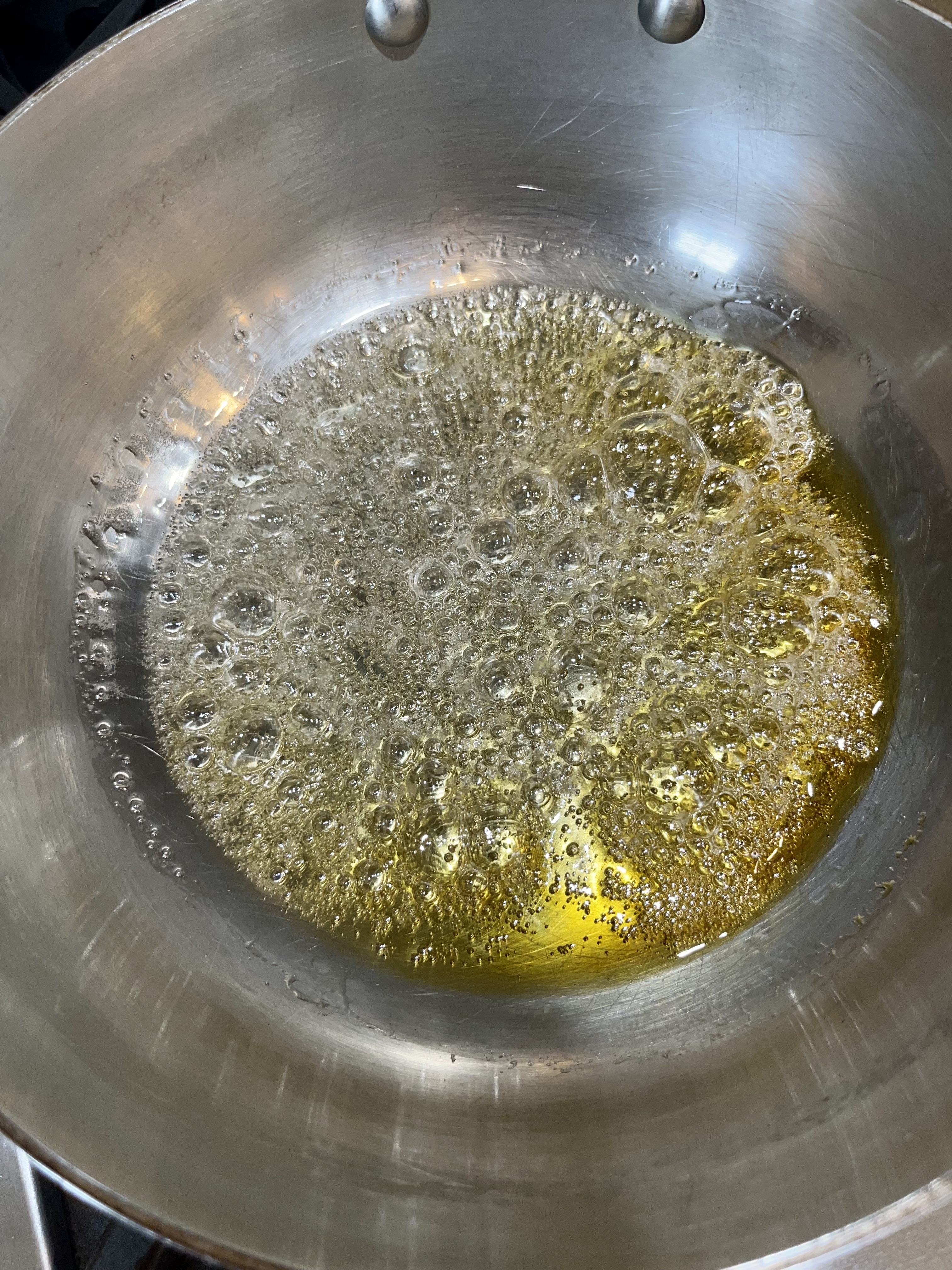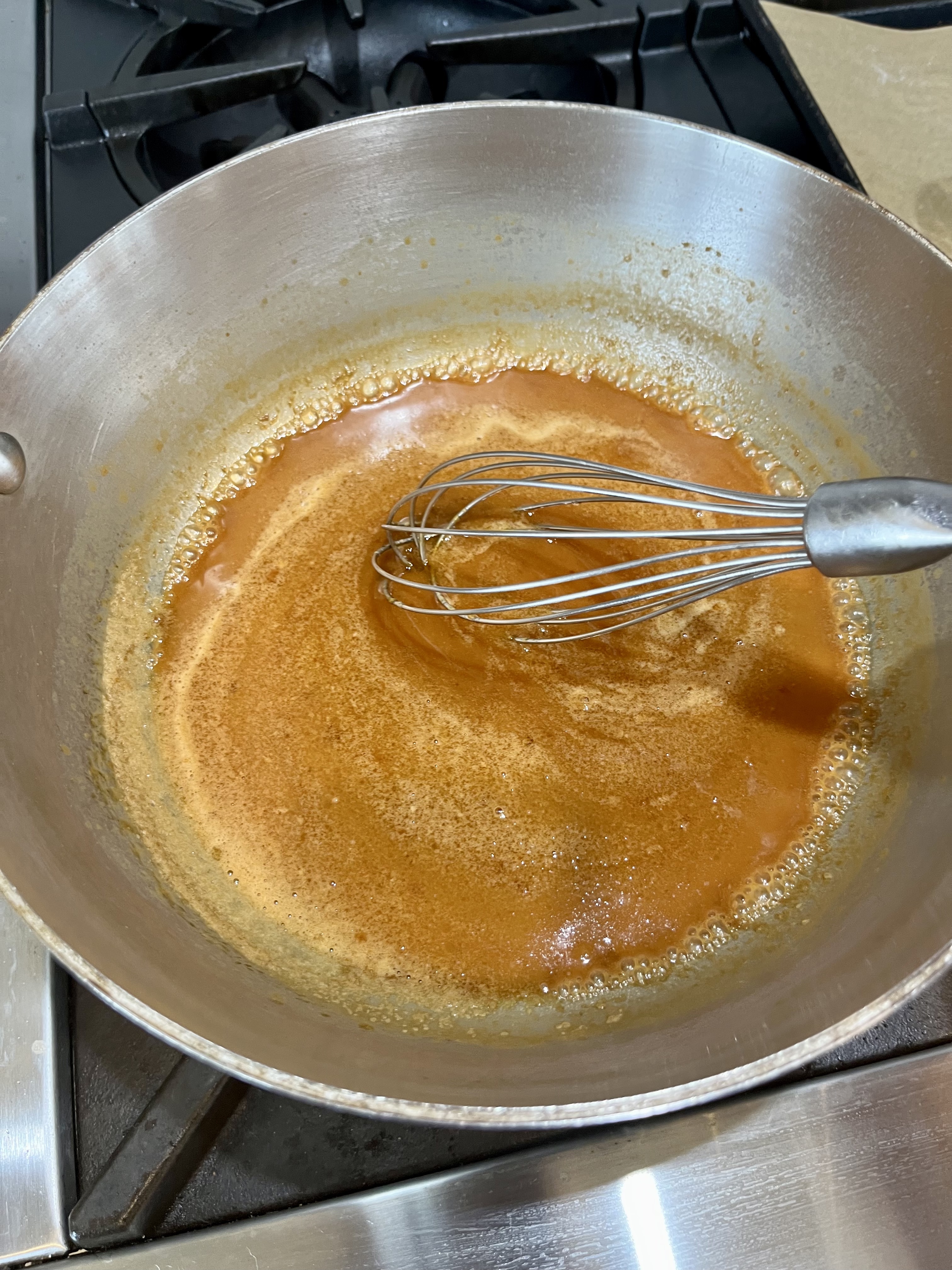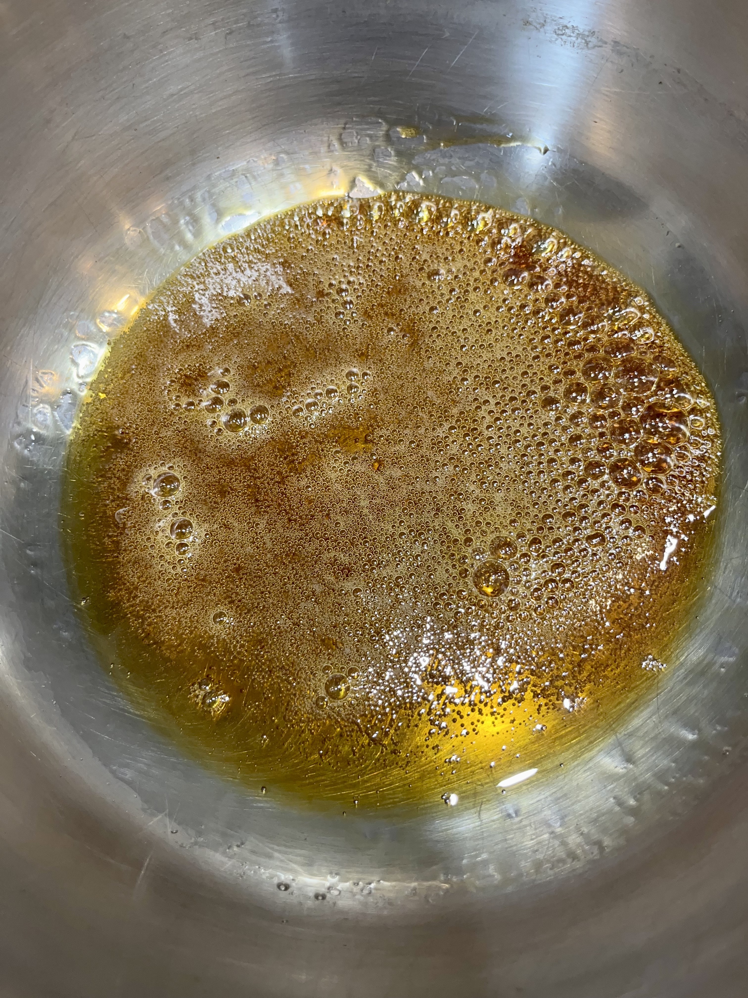 1. Hot, Hot, Hot. While gingerbread bakes, add water to a deep and sturdy, 3 quart saucepan, mix sugar with water, making sure not to stir any sugar on side of pan, and bring to a simmer. . Adjust heat as needed to maintain a gentle simmer- the liquid will start to turn a caramel color- at first you will see the sugar melt into a clear liquid, the liquid will start to bubble, the bubbles will become larger and slower as you begin to see wisps of caramel color in the liquid- usually around the edges.