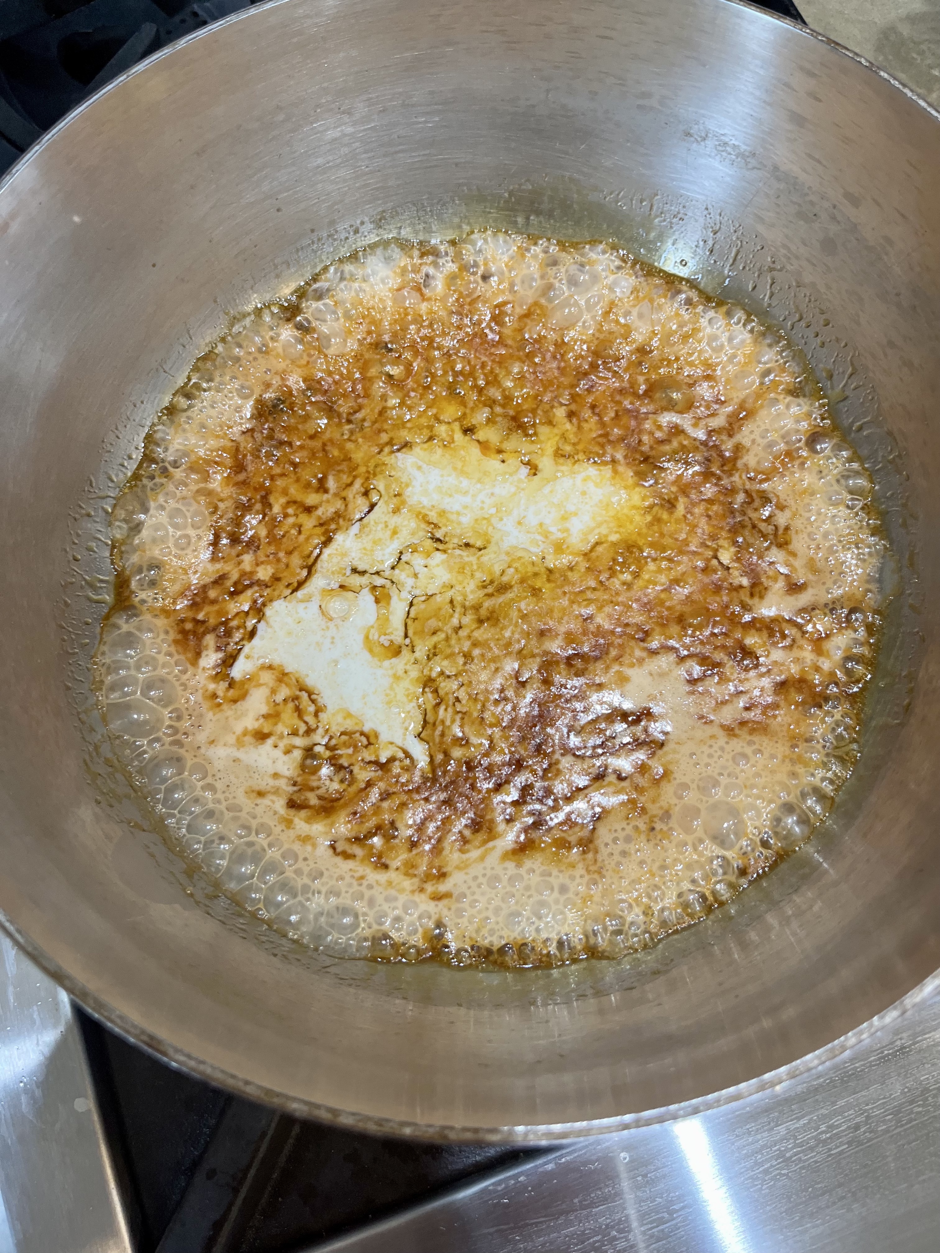 - My polyester leisure suit melted onto my skin when my caramel erupted after I added butter and cream to make a caramel sauce! This was more of a problem way back in the 70s, but even with the more breathable fabric of today, you don’t want to have your fine fabrics or body parts near caramel when you add cooler ingredients because the reactions when the two meet makes the molten caramel spit and sputter it’s hot lava in an around the pot. A deep pot helps keep this under control and being aware that it will happen will keep you on your guard to let the fireworks die down before you get in there to stir things up.