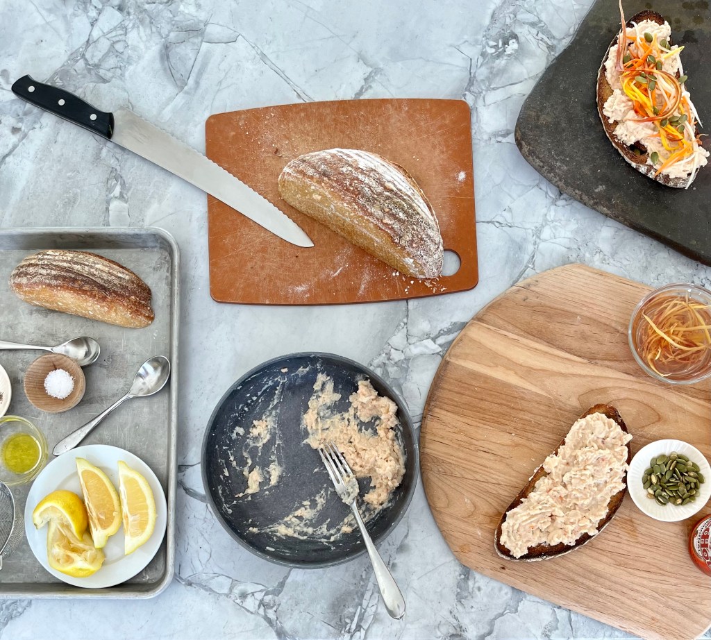Think of the bean spread as your blank canvas to create any palette of flavors that appeal to you- here’s a kimchi and toasted sesame seed topped bean toast, with a little miso mixed in the bean spread, that tasted great to me.