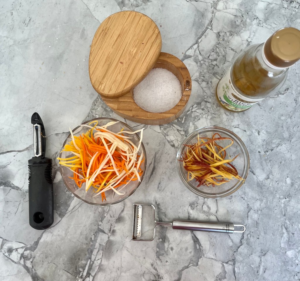 Make Yet Another Quick Pickle. I’m not sure why- given how much a Dad Joke it is- but I just have never been into calling these “Quickles” for some reason- go figure. In any event, if you want to make the pickled carrots seen in this recipe- add a cup of thinly sliced carrots to a mix of 3 tablespoons rice vinegar, a few pinches of salt and water to cover carrots and stir from time to time until they taste pleasantly tart.