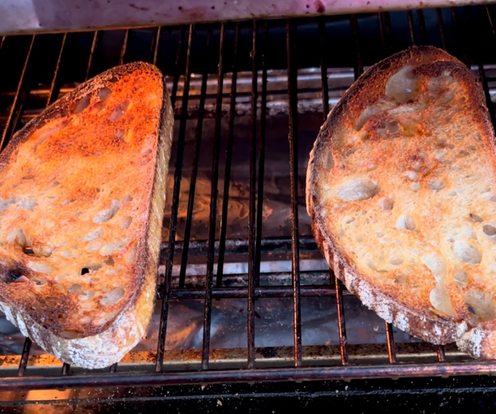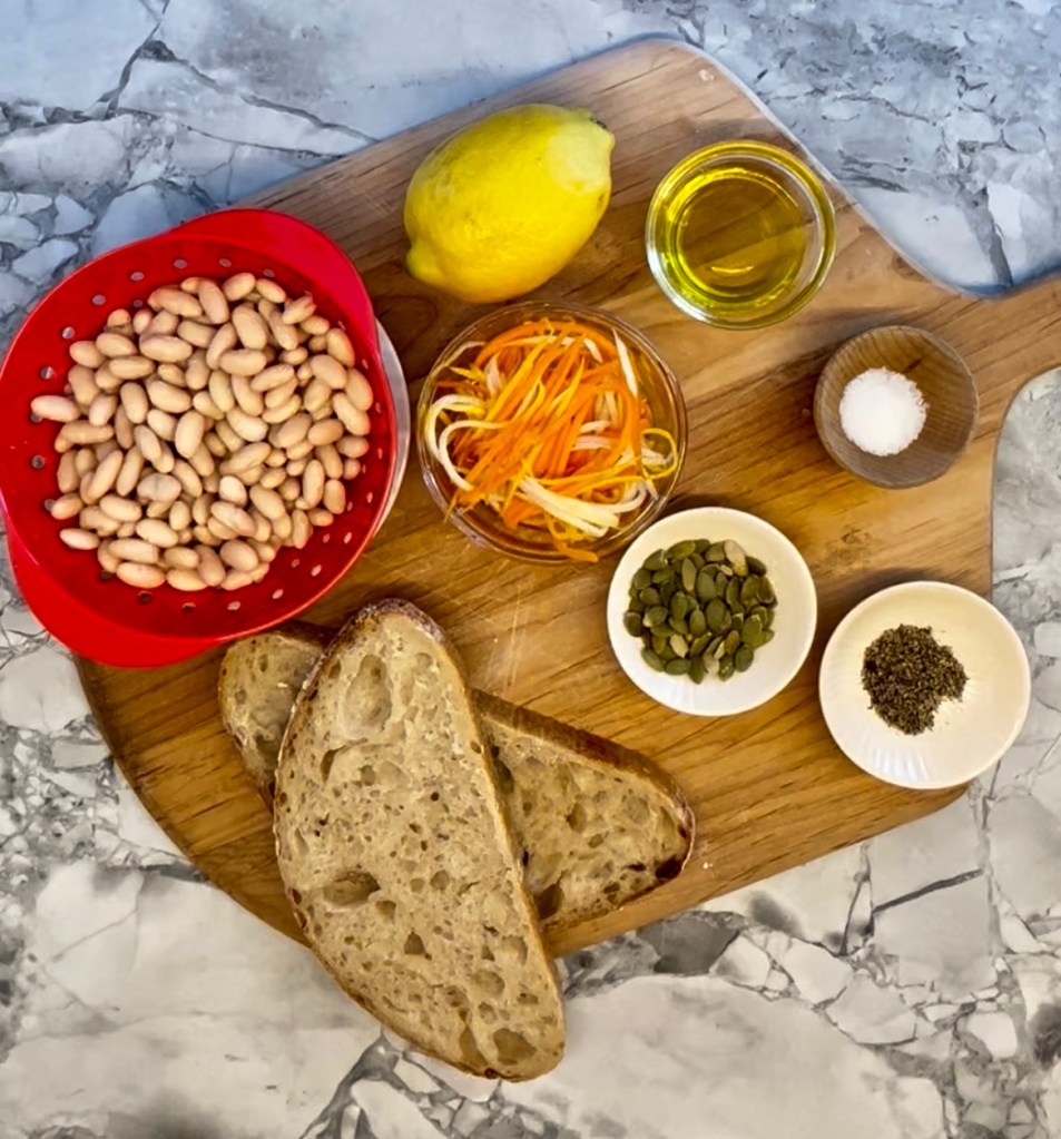 1. Your Toast. Toast bread in toaster/toaster oven- make the bean spread while bread toasts. Fancy people out there- you know who you are- can certainly make their toast in the oven with a layer of butter or oil spread on the bread, seasoned with salt and pepper, if they like. I like to get fancy sometimes myself.