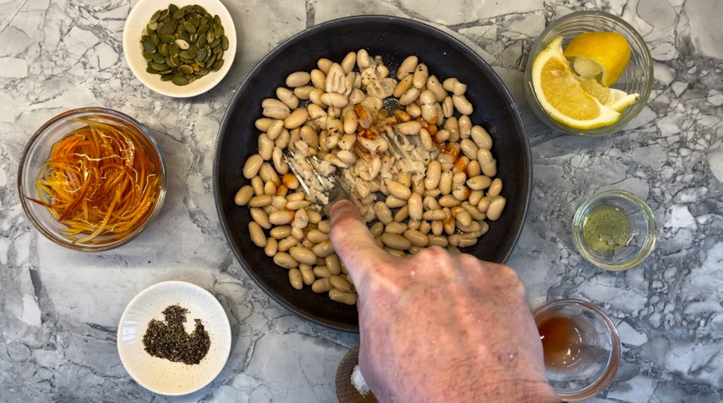 2. Rustic & Easy. Get a medium shallow bowl, add beans, extra virgin olive oil, lemon juice, hot sauce, salt and pepper. Mash with a big fork for rustic appeal. Taste and adjust taste and texture with oil, lemon, heat, salt, pepper as you wish. For a looser/smoother texture, you could also add water, which we know “ez ze ennemi of flavóur!”, but sometimes you don’t want to overwhelm the subtle flavors, like the beans, with more fat and acid, so in this case, “water ez ze frennemi of flavóur!”.