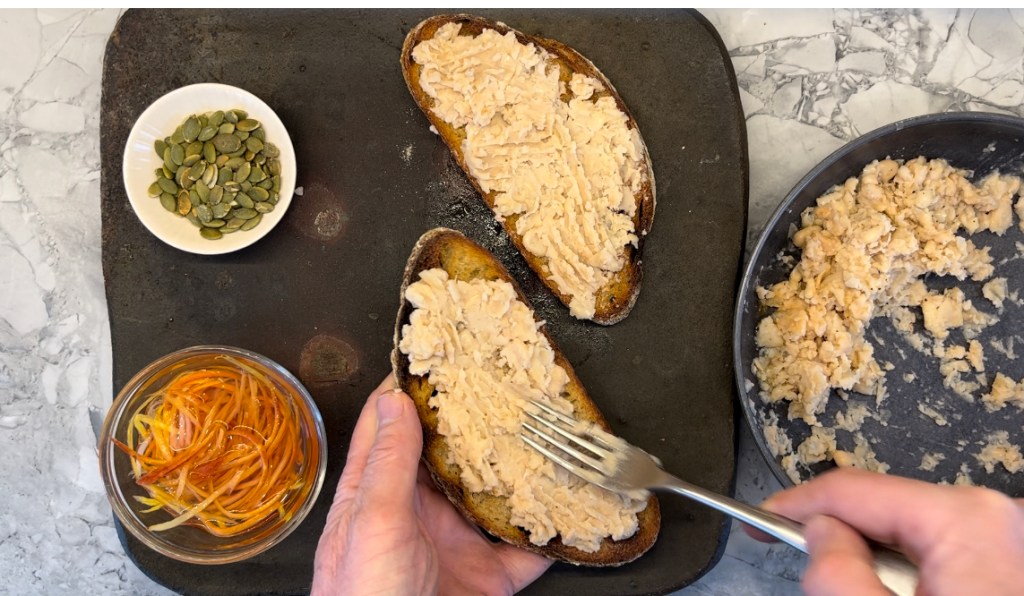 3. Time For A Toast! Layer a nice amount of bean spread on your toast. Eat au naturel or top with something you enjoy, like any one or more of the following: salsa, dressed greens, egg, roasted veggies, crumbled/shredded cheese, cured/ cooked meat mince, pumpkin/other seeds, crushed wasabi peas, sliced/minced nuts, sliced radishes/fresh veggies, kimchi/other pickles. Make it look good. Leftover bean spread keeps covered in fridge for several days.