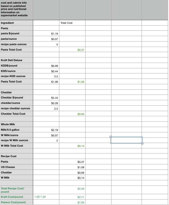 Penny Pinching. If you can trust my math (Mom doesn’t), the cost of 16 ounces of the Spawn is about $2.29, while Kraft’s is about $2.71; and Panera’s is about $7.99 for the same amount. I actually created a cost spreadsheet in honor of your Auntie, who is very tough when it comes to spreadsheets- rumor has it she made a coworker cry over formatting- so I hope she approves.