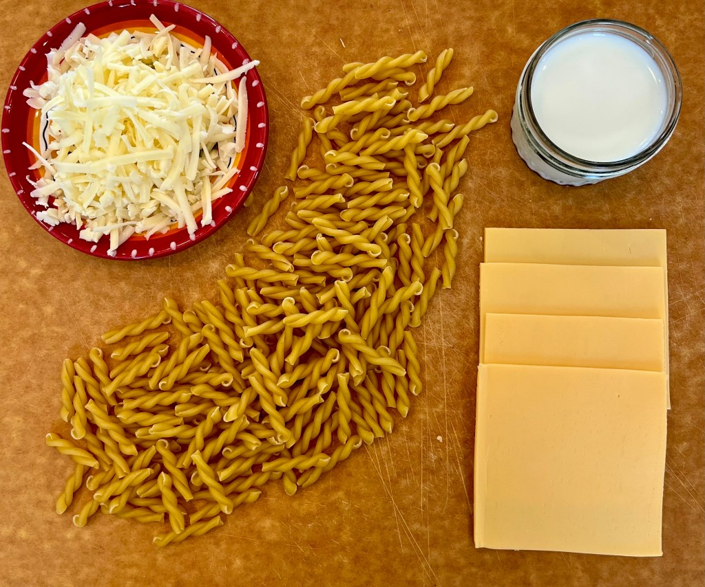 As for the real cheese, I used only white cheddar in this recipe, but I usually use a combination of cheeses. A tastier cheese like cheddar, swiss or parmesan, along with whatever “melting cheese” is languishing in the Cheese Box in the fridge (our “house” often brings in cheeses that get “lost” and get moldy before they’re “found”, so I had to put together a Cheese Box to keep track of it all). Cheeses that melt nicely, hence the term “Melting Cheese”, include Monterey Jack, Fontina, Gouda, Havarti, Muenster and Brie. So experiment with whatever you have or like and feel free to add more than the 2.5 ounces suggested in the recipe to suit your tastes- perhaps adding a bit more liquid to round it out if you do.