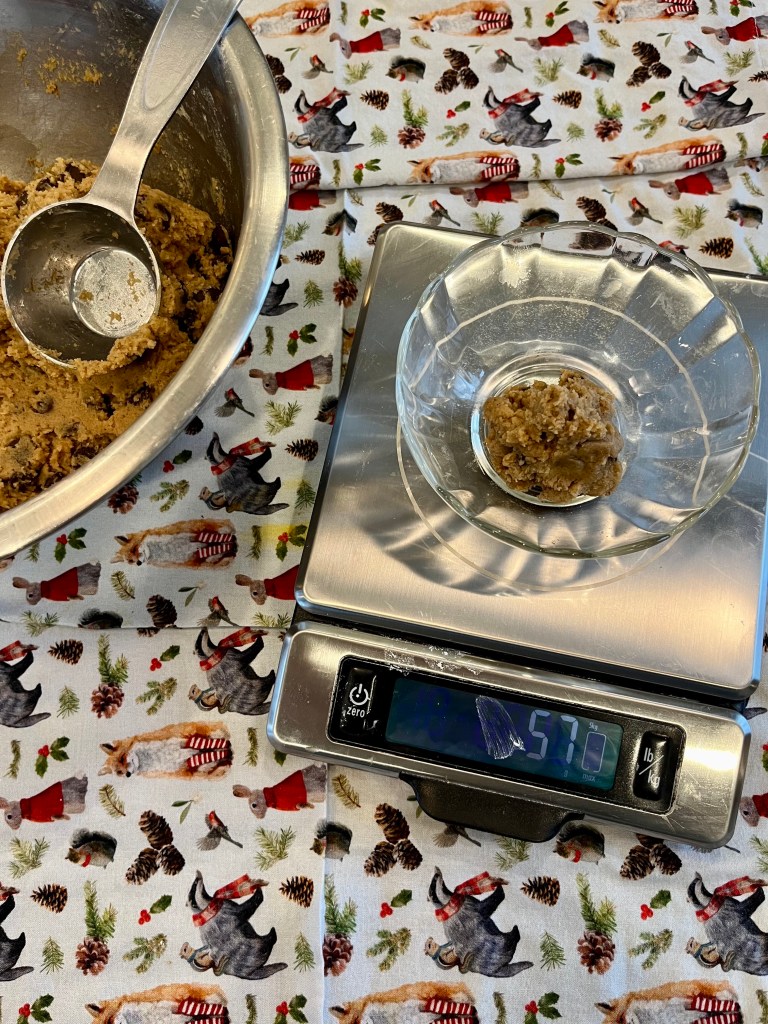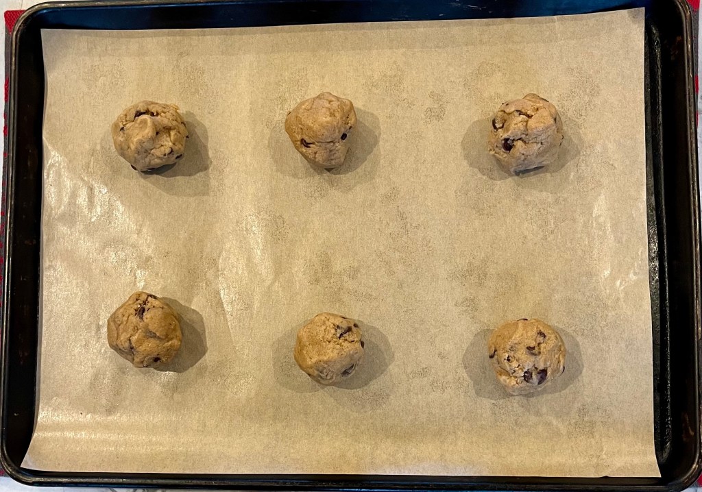 5. Get Rolling. Use a measuring cup or your very clean hands to form balls of dough that equal about 57 grams (2 ounces or 1/4 cup), and place about 2” apart on a baking sheet lined with parchment paper. If you have the time, many folks think the cookies taste better if you cover and chill the dough balls for 2-48 hours- try it if you’re the curious type with time on your hands.