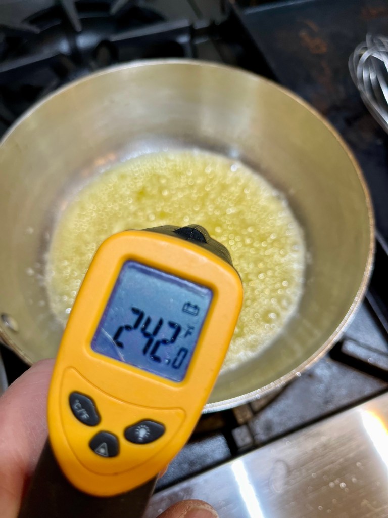 Blinded By Science. Since you are a person of science- you know, like how you help me with the sciencey stuff in the NYT crossword puzzles and, oh yah, your college degree, too- keep in mind that butter burns at 350° and sugar/caramel burns at just around 400°. If you’d like to monitor this, use an infrared thermometer to check the temperatures of your butter and caramel- I do, not because I’m sciencey, but because I love pretending the infrared thermometer is a ray gun or phaser that I zap my food with! PS- the “caramel” in the Scaredy Cat Caramel Sauce gets no where near 400°- lower 300°s- when it thickens because that sauce gets it caramel color and a bit of caramel flavor from the molasses in the brown sugar- not that there’s anything wrong with that- it’s just not a true caramel.