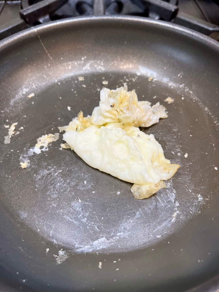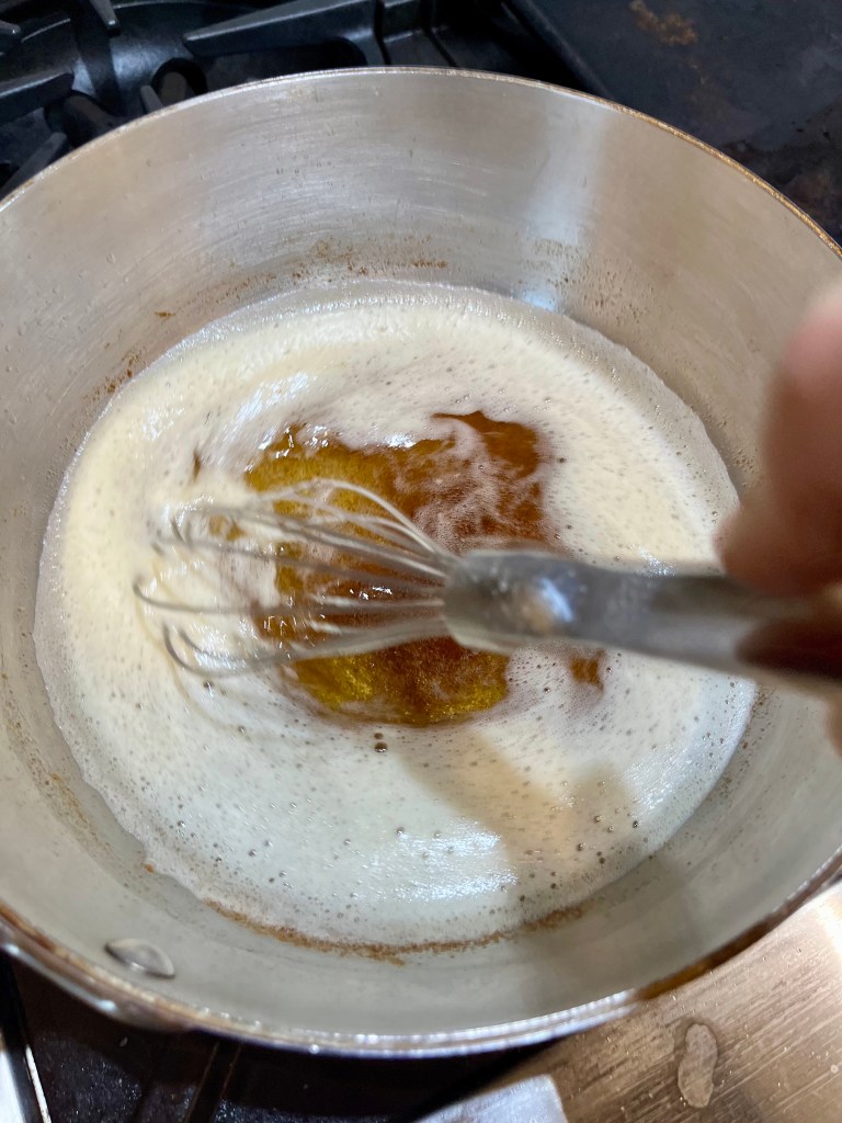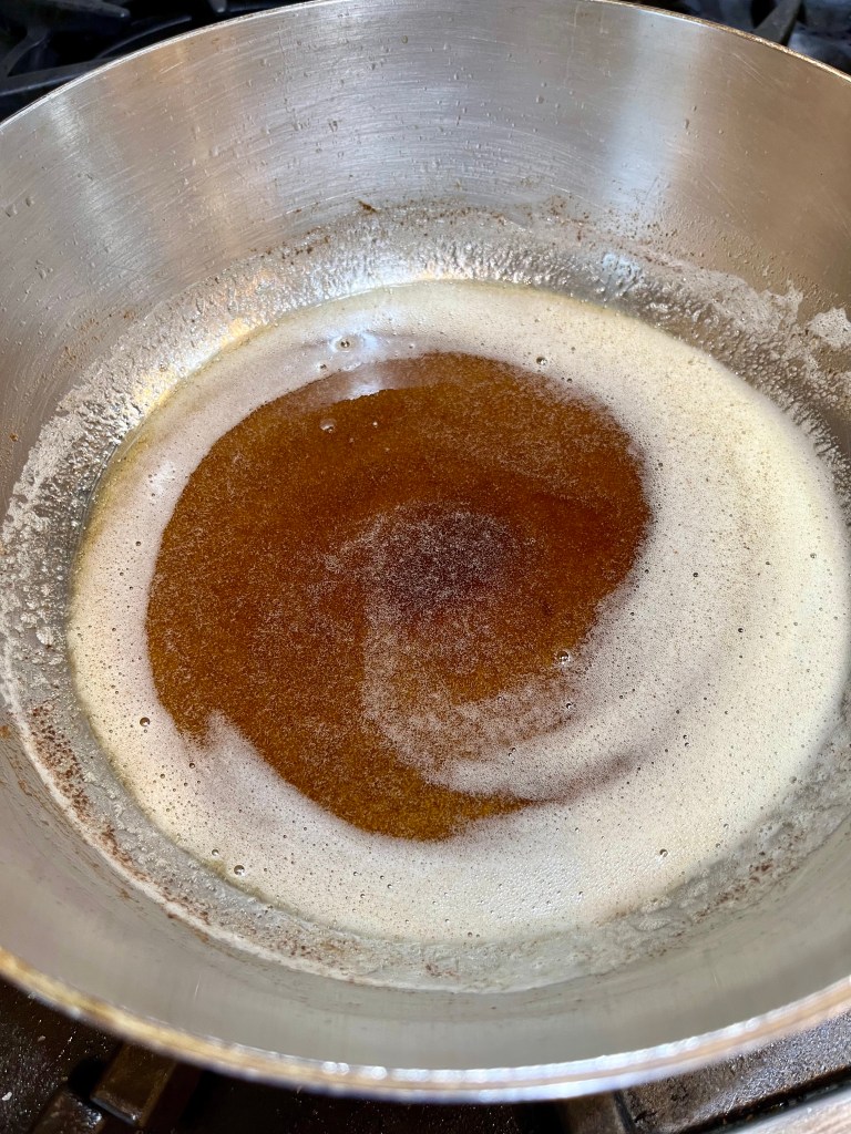 I set up a “safety pan” for show, not thinking I’d need to use it, but at the last minute, I accidentally and without realizing it, hit the celcius button on my infrared thermometer, creating confusion (which happens more than I like to admit) just when the butter was nearing 350 fahrenheit (about 176 celsius), so I actually ended up needing it and it totally saved the brown butter- whew!