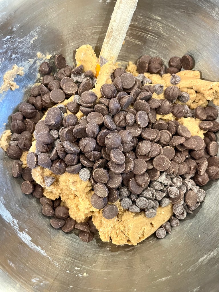 4. Dry Bowl. In a separate large bowl, whisk together flour, baking soda, salt and espresso powder, if using. Slowly add half this mix to the butter-sugar mix and beat on low-speed just until combined and them add remaining half of this mix until just combined. Add chocolate chips and mix or fold in until evenly incorporated into dough.