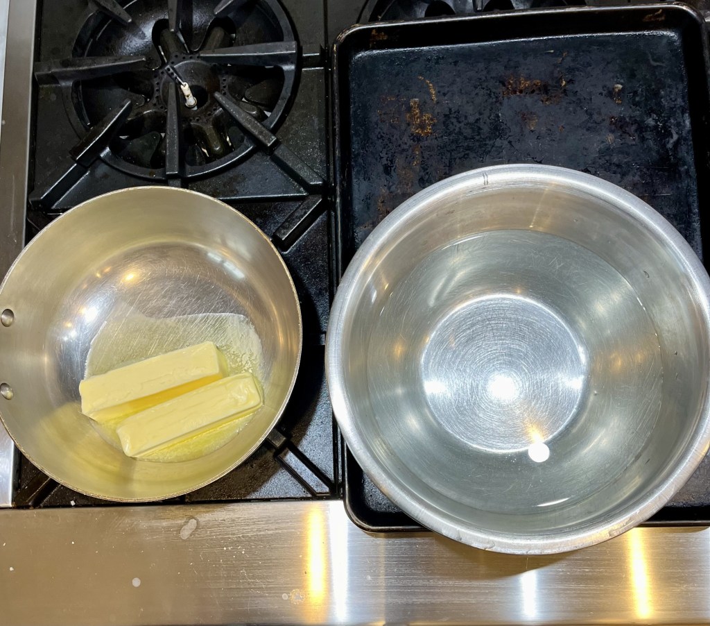 Heat Management. If you care for extra protection against burnt brown butter (aka black butter) and for a dazzling steam show, have a pan large enough to dip your butter saucepan into set up next to your butter pan. Fill it 3/4 full with tap water so you can carefully and immediately place the bottom of the butter pan into the water to immediately stop the cooking. You could do this as a precaution with caramel too, but if you’re making a sauce, the butter and cream do a nice job of cooling things down.