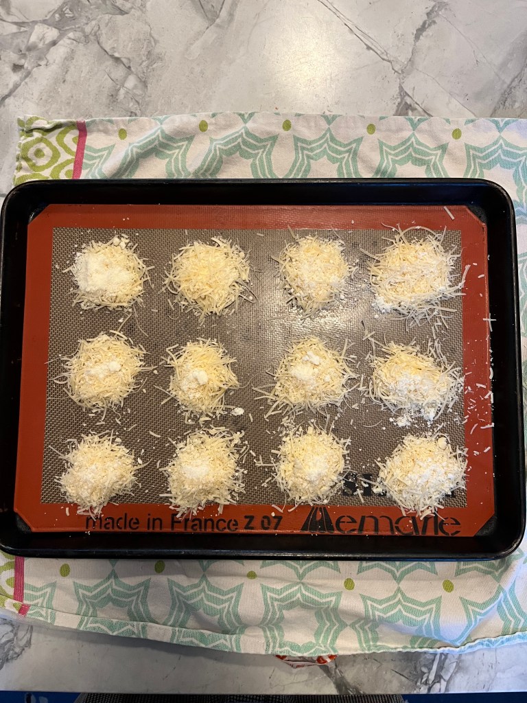 1. Parmesan Crisps. If you’re making Parmesan Crisps, preheat oven to 350°. Make as many 2-3 tablespoons mounds of grated Parmesan that will fit comfortably on a Silpat covered baking tray and bake until melted and starting to brown- 20-25 min.